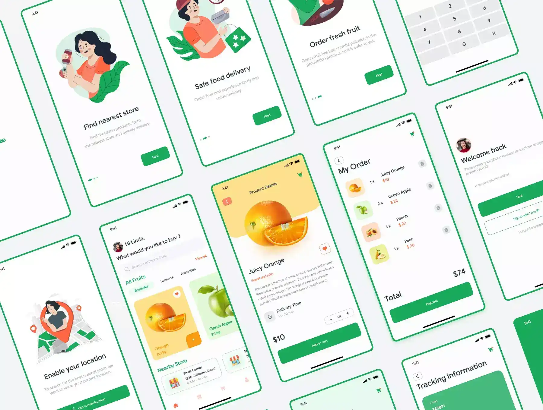 Fruitee UI Kit coming to you with 16 screens (Light Mode available) with iPhone X screens (375px x 812px), ready to use and easy to customize!