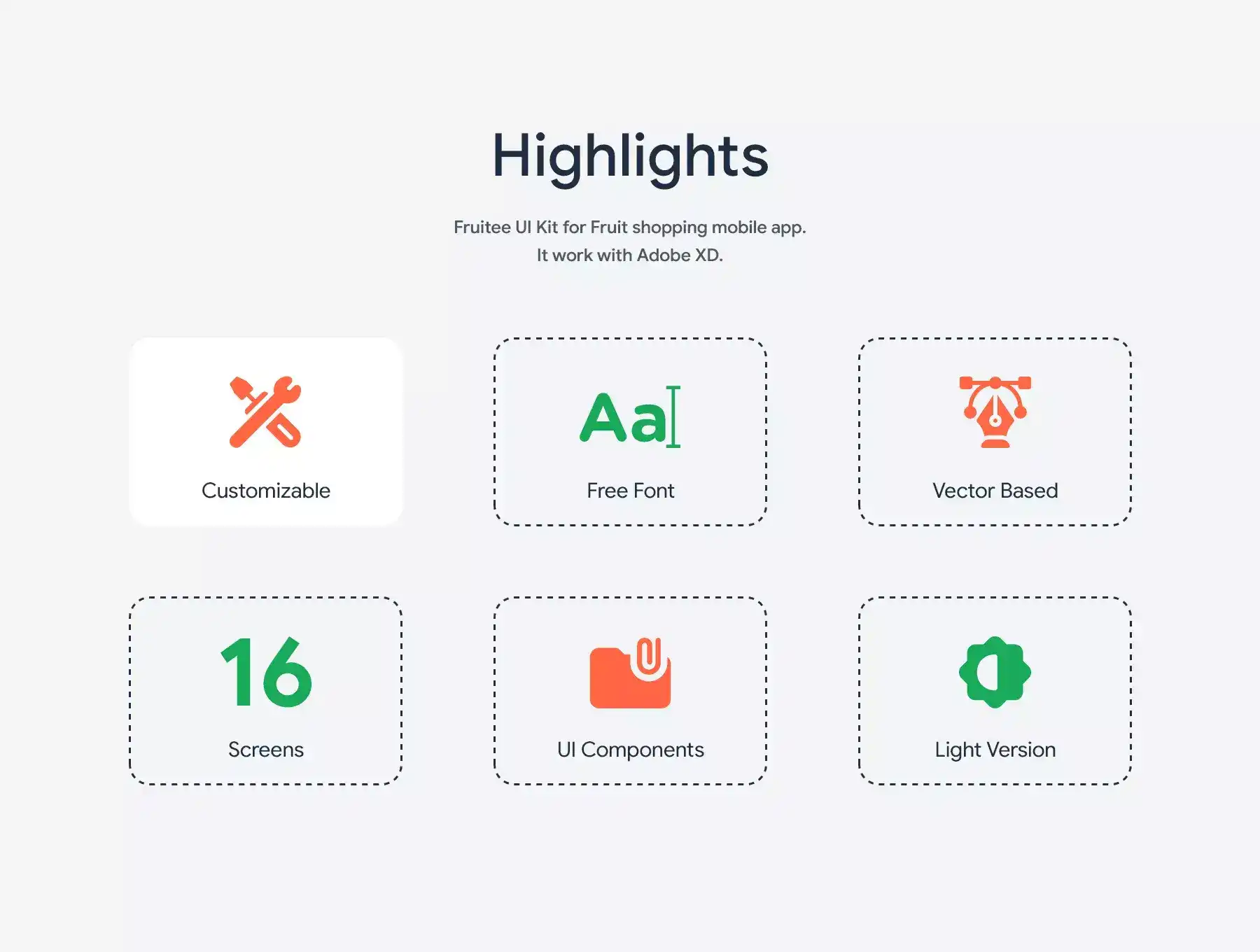 In addition, Fruitee UI Kit is really awesome for you Adobe users! We already made vector and illustration with well-layered, organized, responsive resize, the color is easy to change, and text styles, and also we attached with free fonts family (so you don't need to download additional fonts) and free icon.