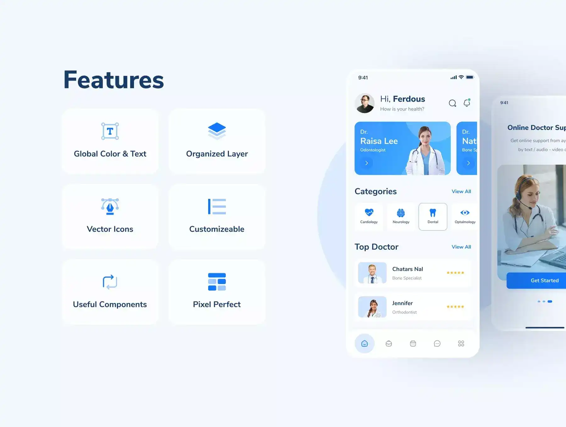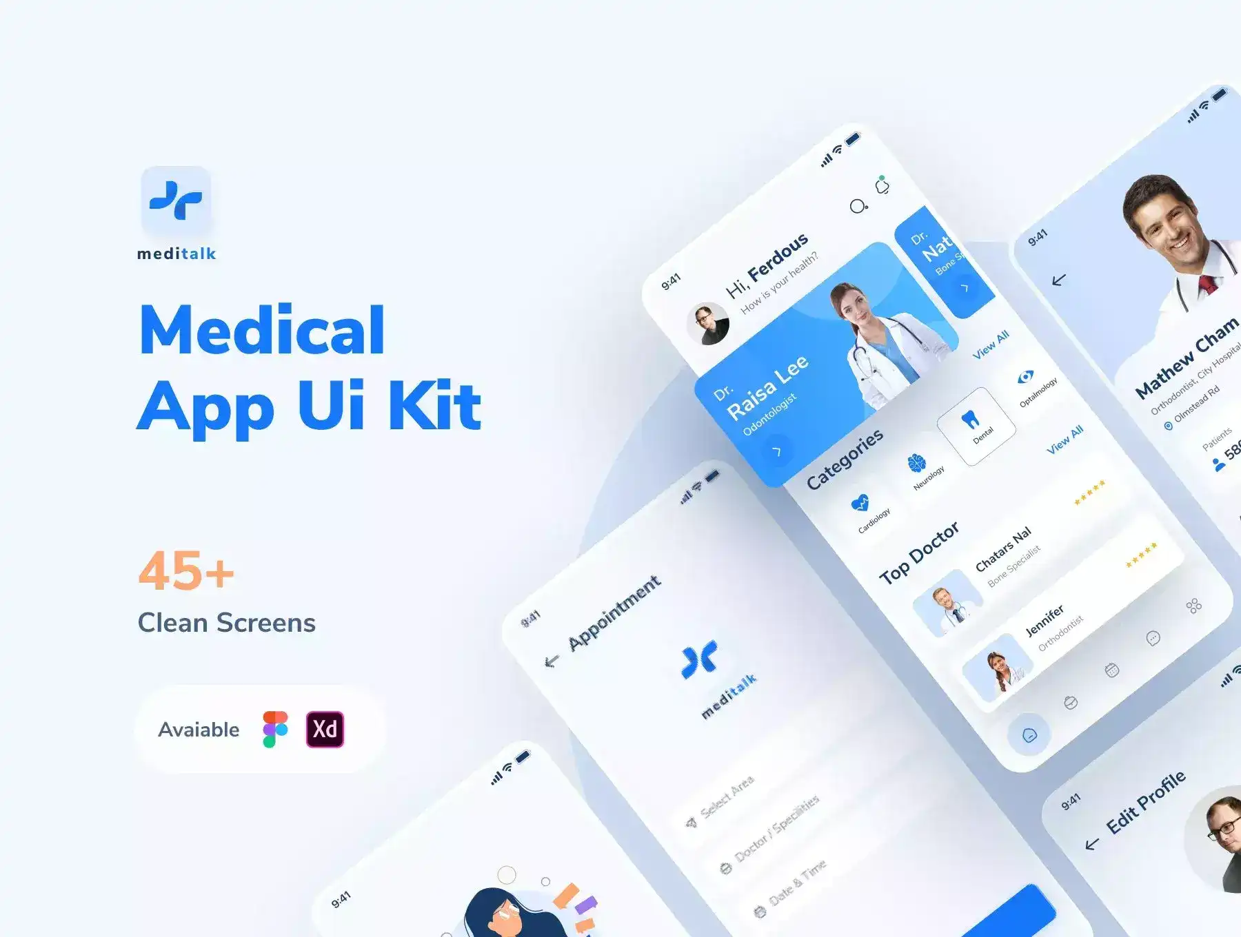 MediTalk - Medical App UI Kit is designed with modern design trends. Small or large scale, suitable for all startups and businesses that provide accommodation services. Package includes 45+ Doctor Booking screens and works in Figma. You can completely edit the components easily. We continue to add new things to make our template more beautiful and strong every day. You will be free to use all our updates.