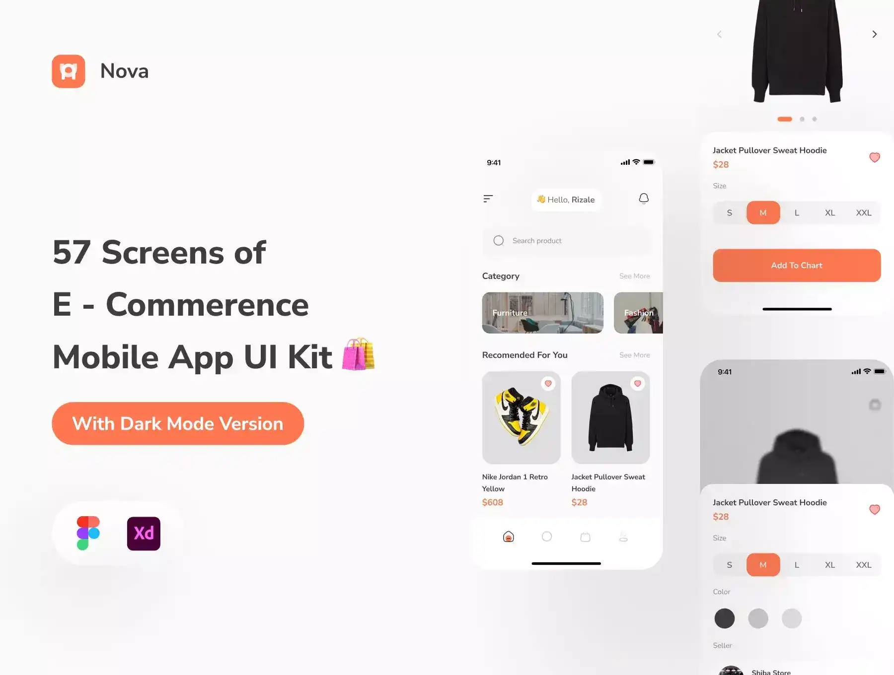 What is nova? Nova is an e commerce application where you can buy all the items you need that we have provided, various categories that allow everyone to have them, we designed them with 2 different styles that will be the center of attention for the application.
