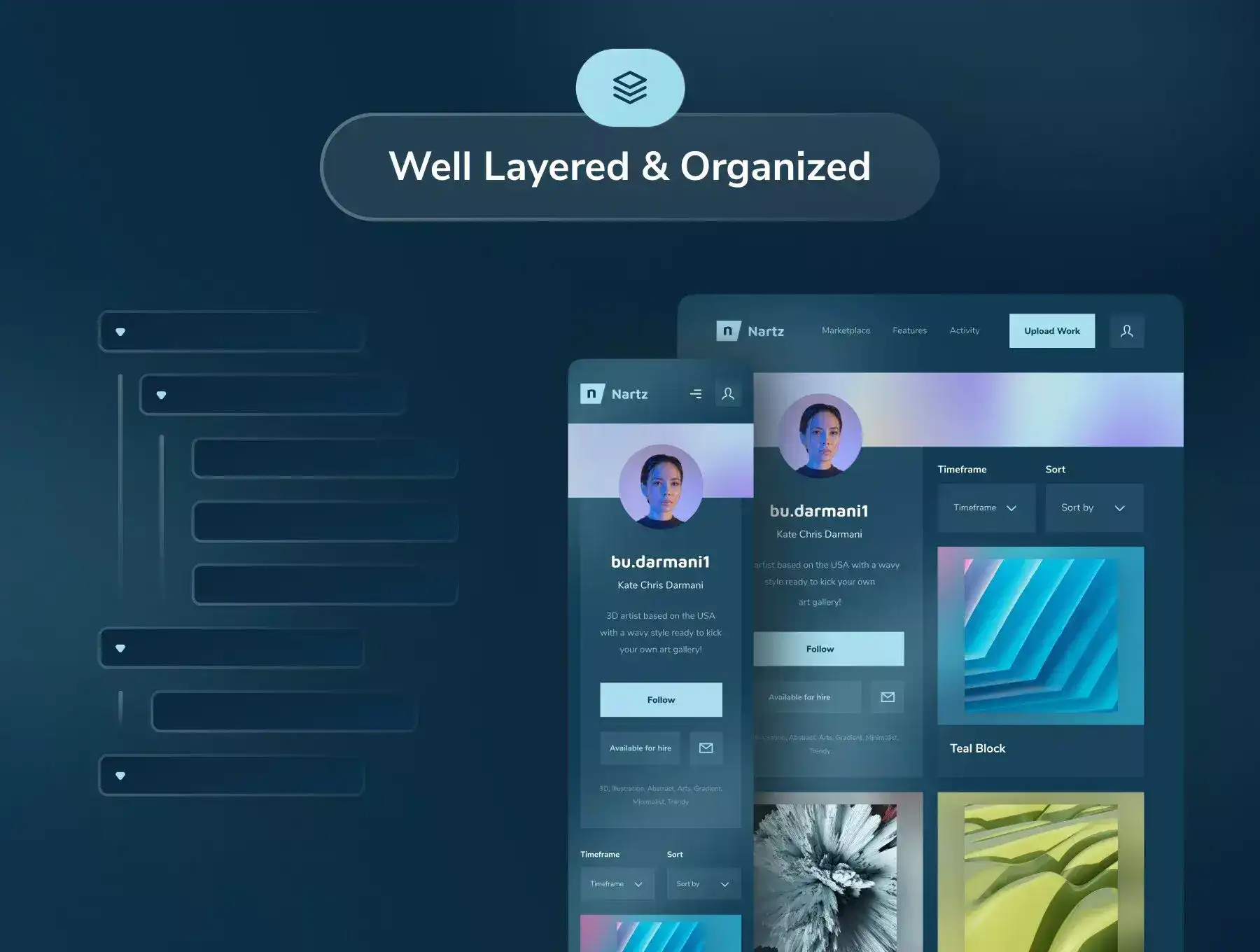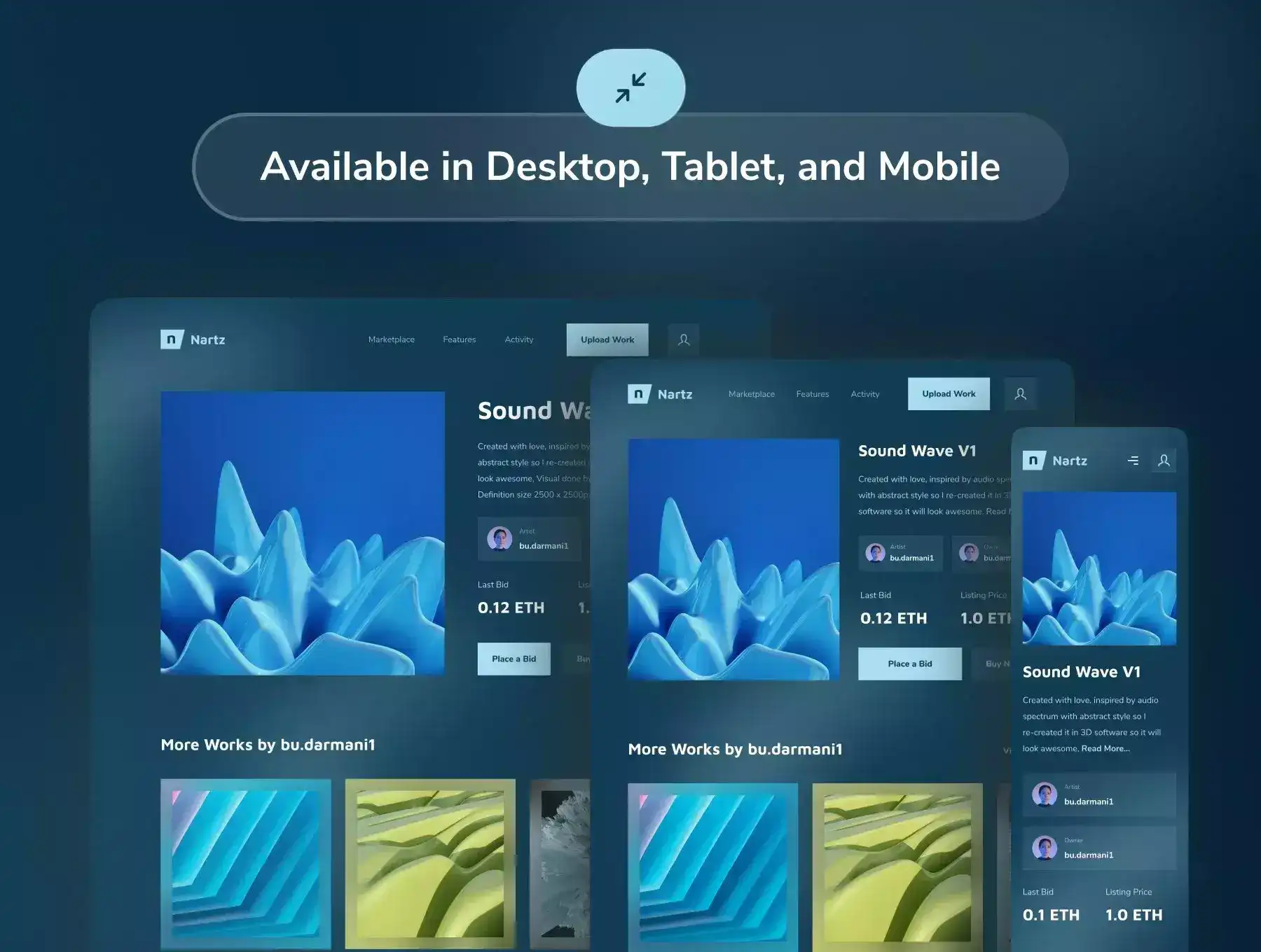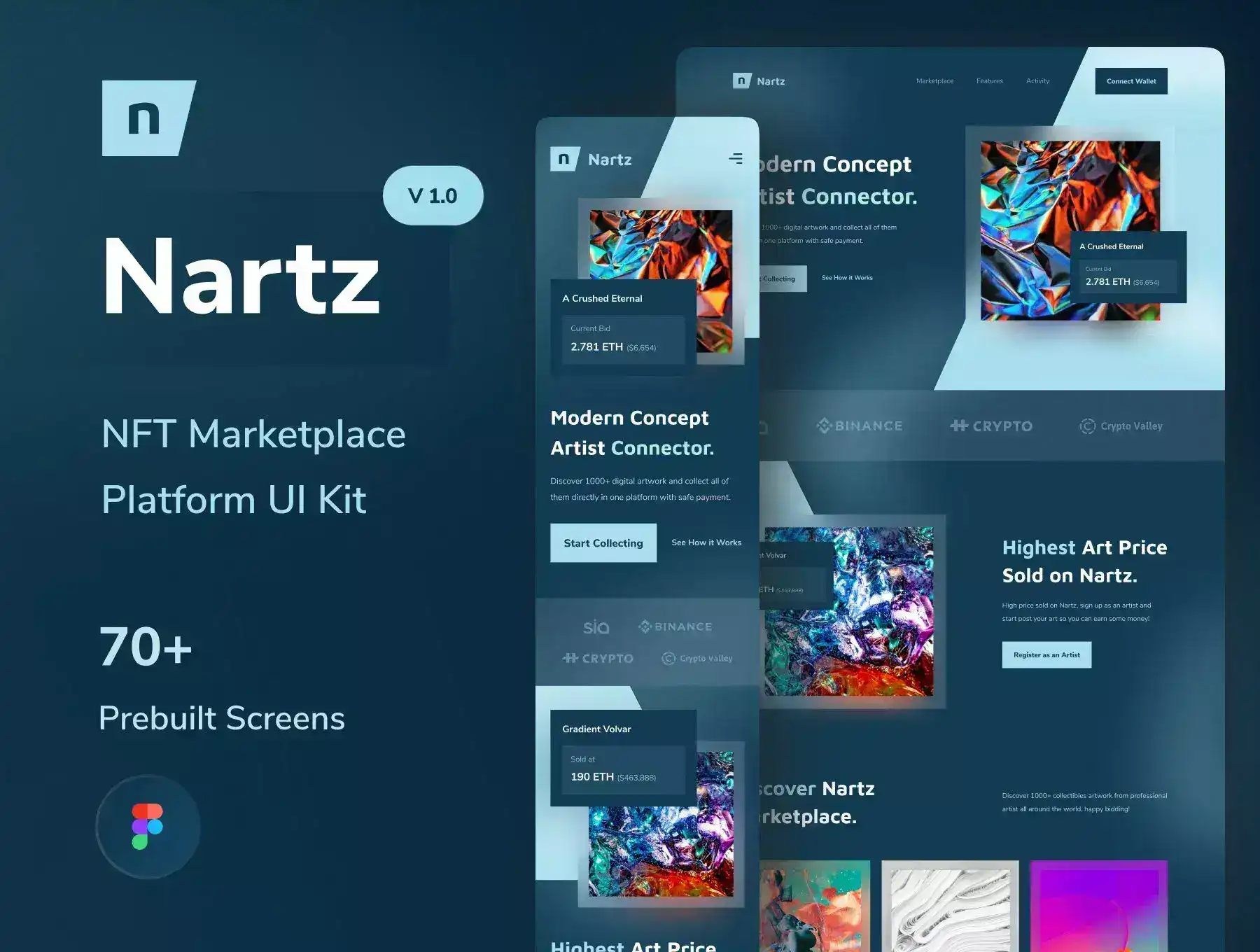 Nartz is a NFT Marketplace Platform UI Kit with a clean dark mode and sleek style that contains 70+ prebuilt screens with a responsive design for desktop, tablet, and mobile screen ready to use and ready to kickstart your design process.