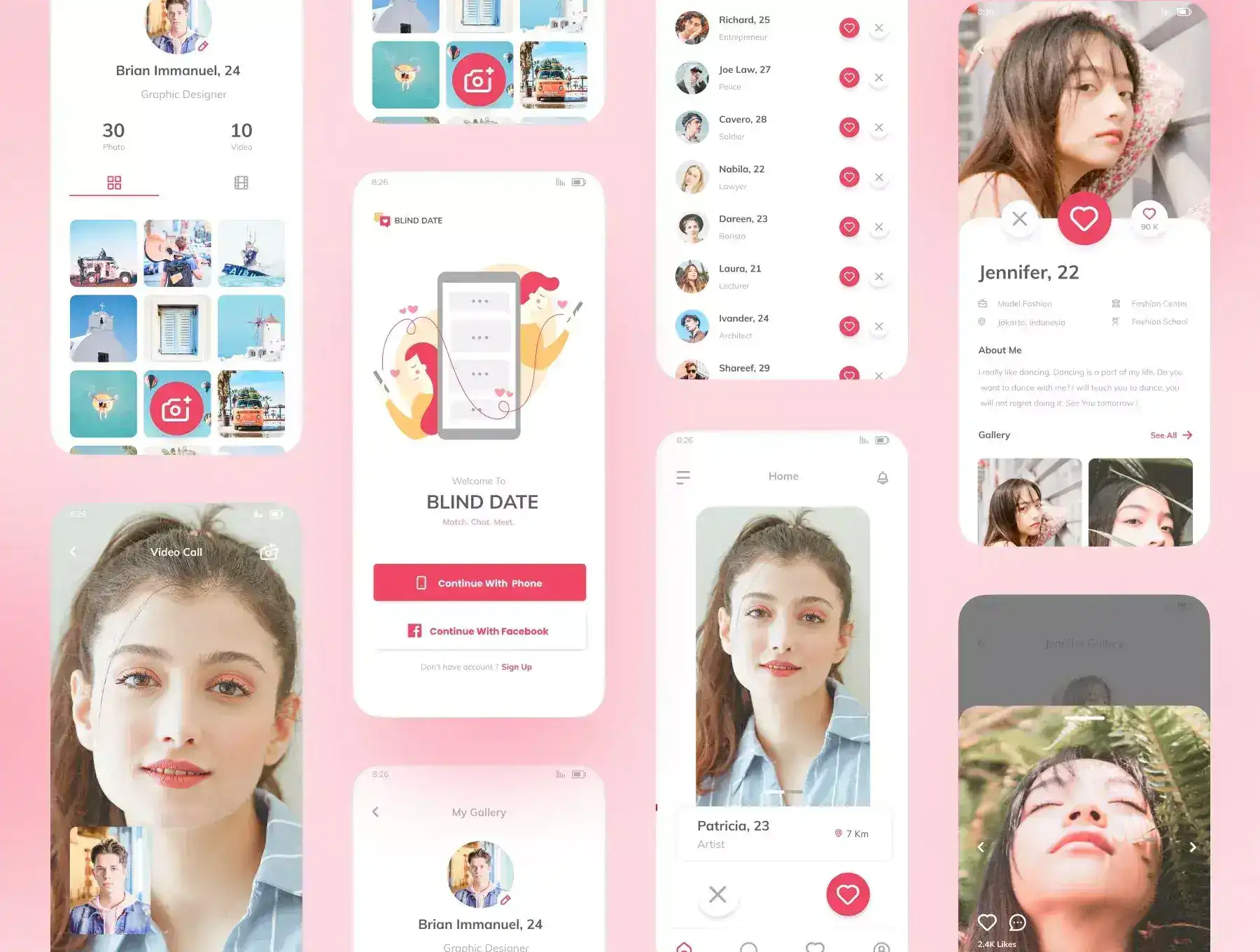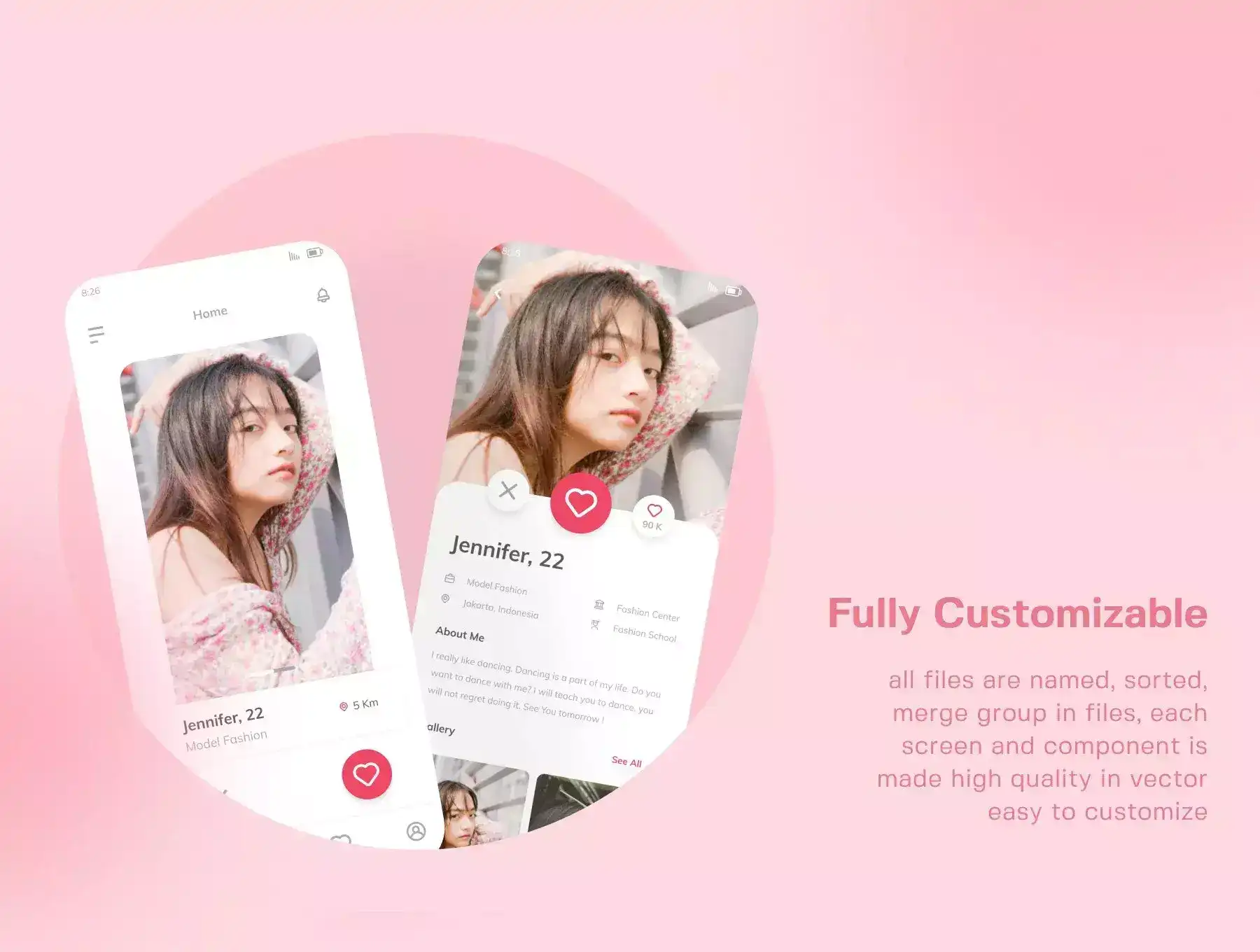 Date App is a UI Kit that covers dating search designed with Figma to implement in UI: automatic layout, modern design, and simple