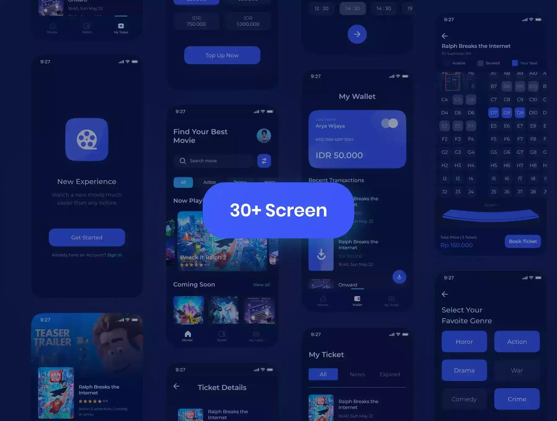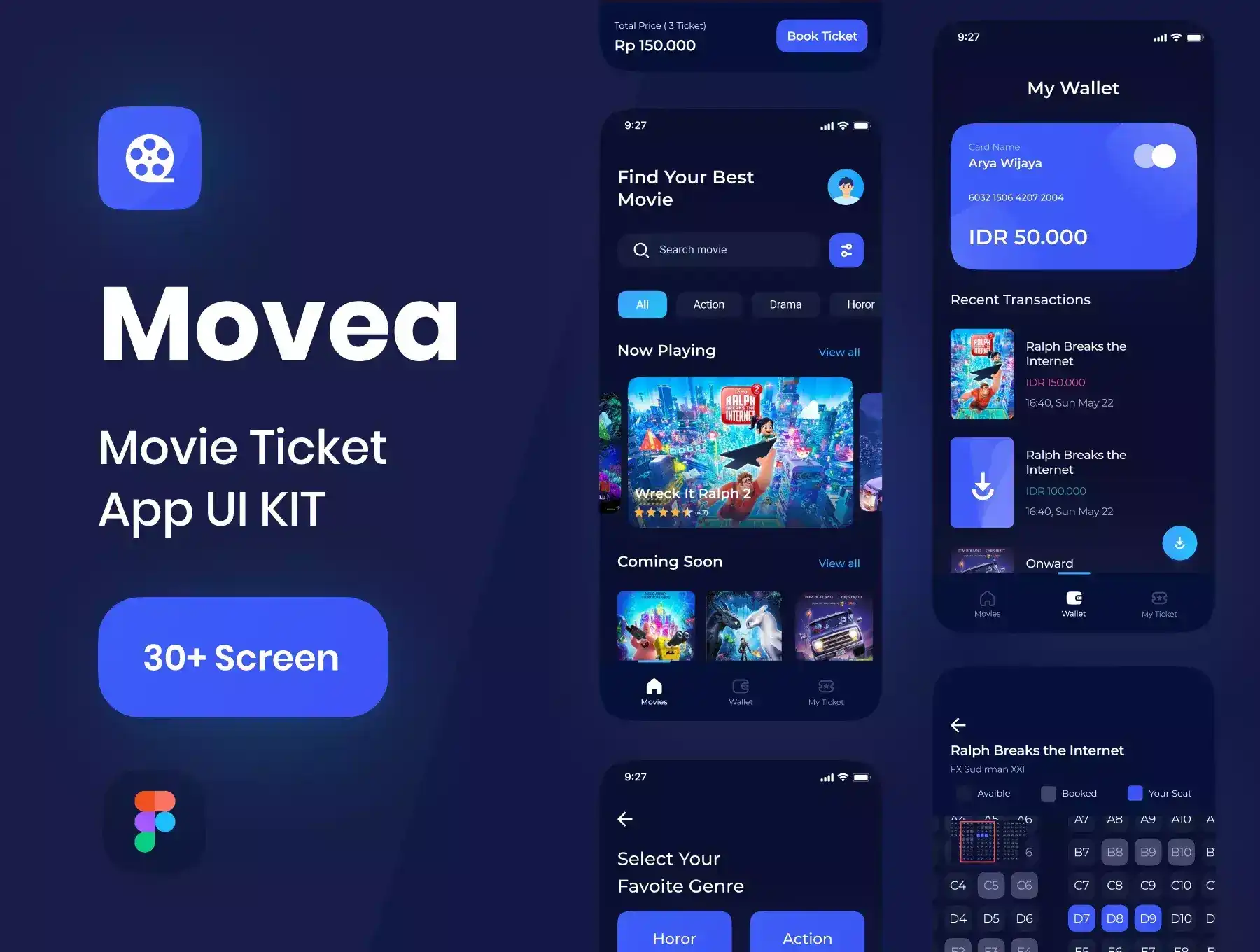 Movea is a movie ticket mobile app design, This design made in Figma. This design can be used for online movie tickets and mobile apps. you can easily edit and customize all elements with variant features which can speed up your design process. This app includes some feature like seeing the schedule of movies that are currently showing or movies that will be shown