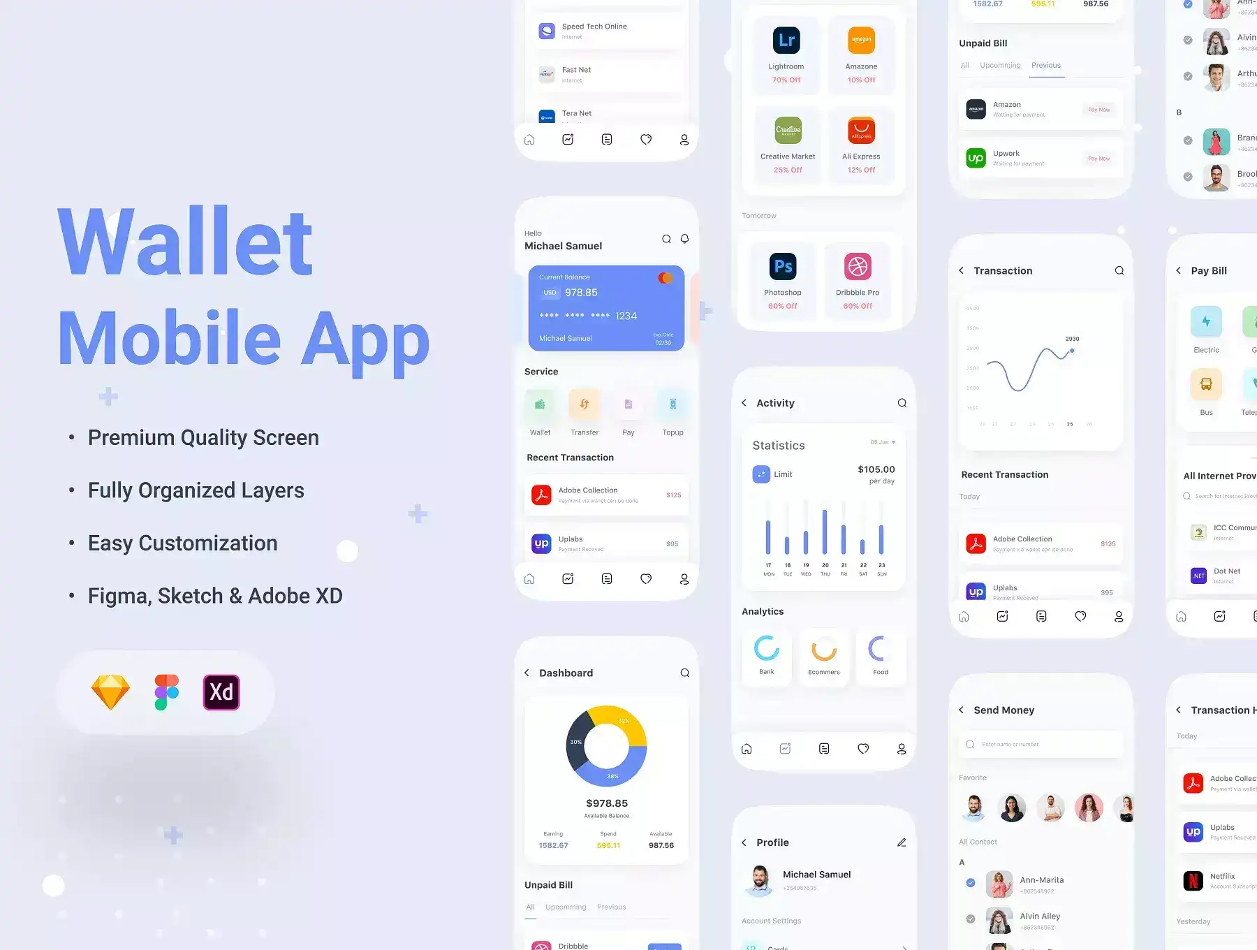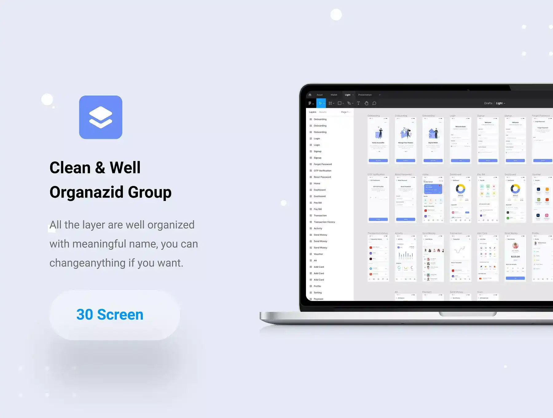 This is a modern, clean, and very detailed UI kit for iOS and Android apps. You can use this app template to create banking apps, crypto wallets, and budget planners. We designed 30 beautiful unique screens for your mobile app, each screen designed for touch devices. All symbols and objects are vector-based and easily editable.