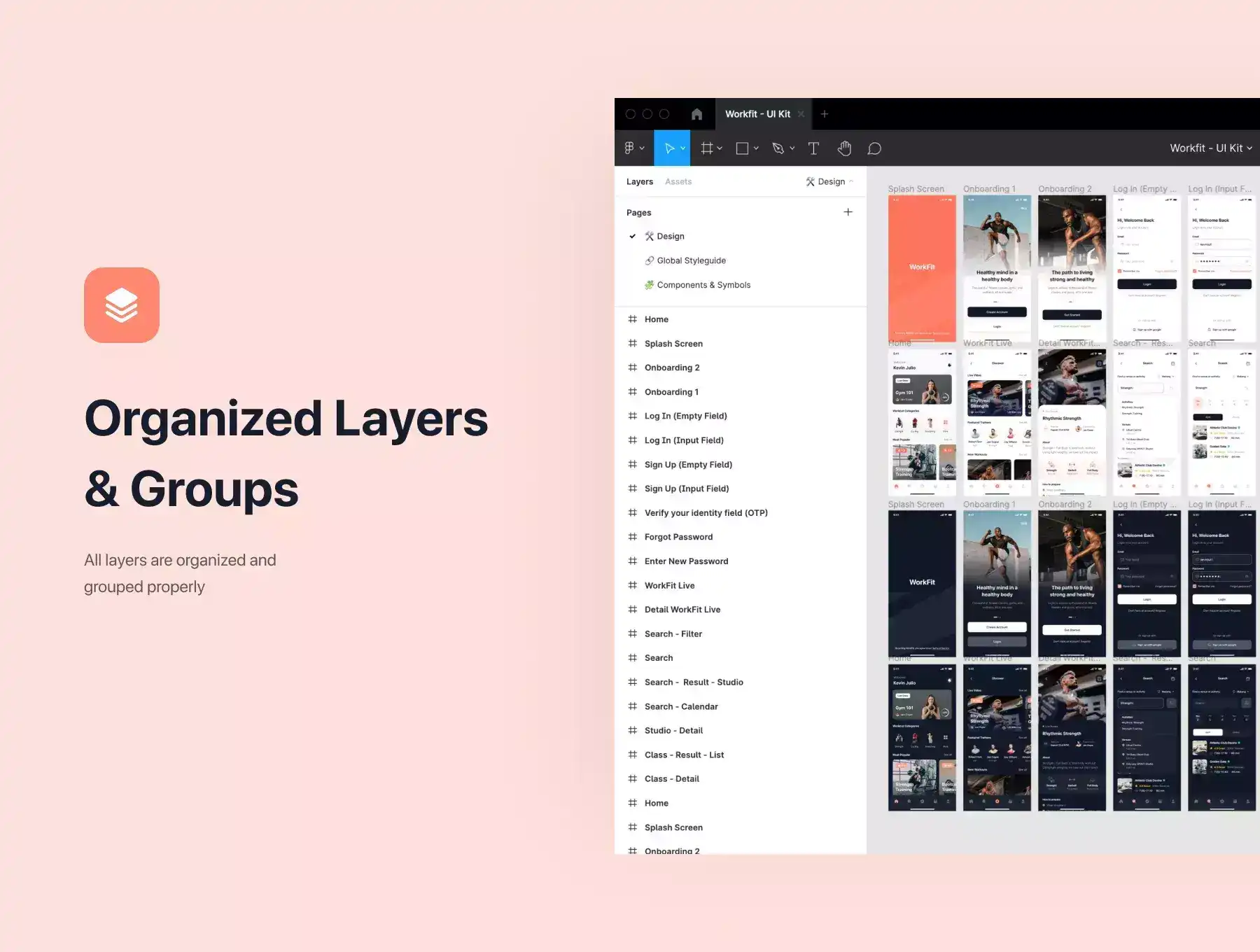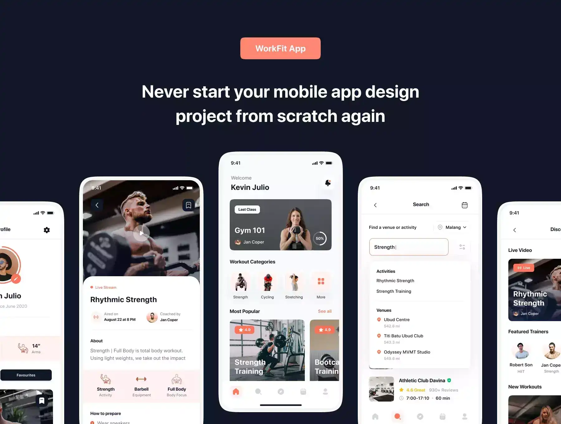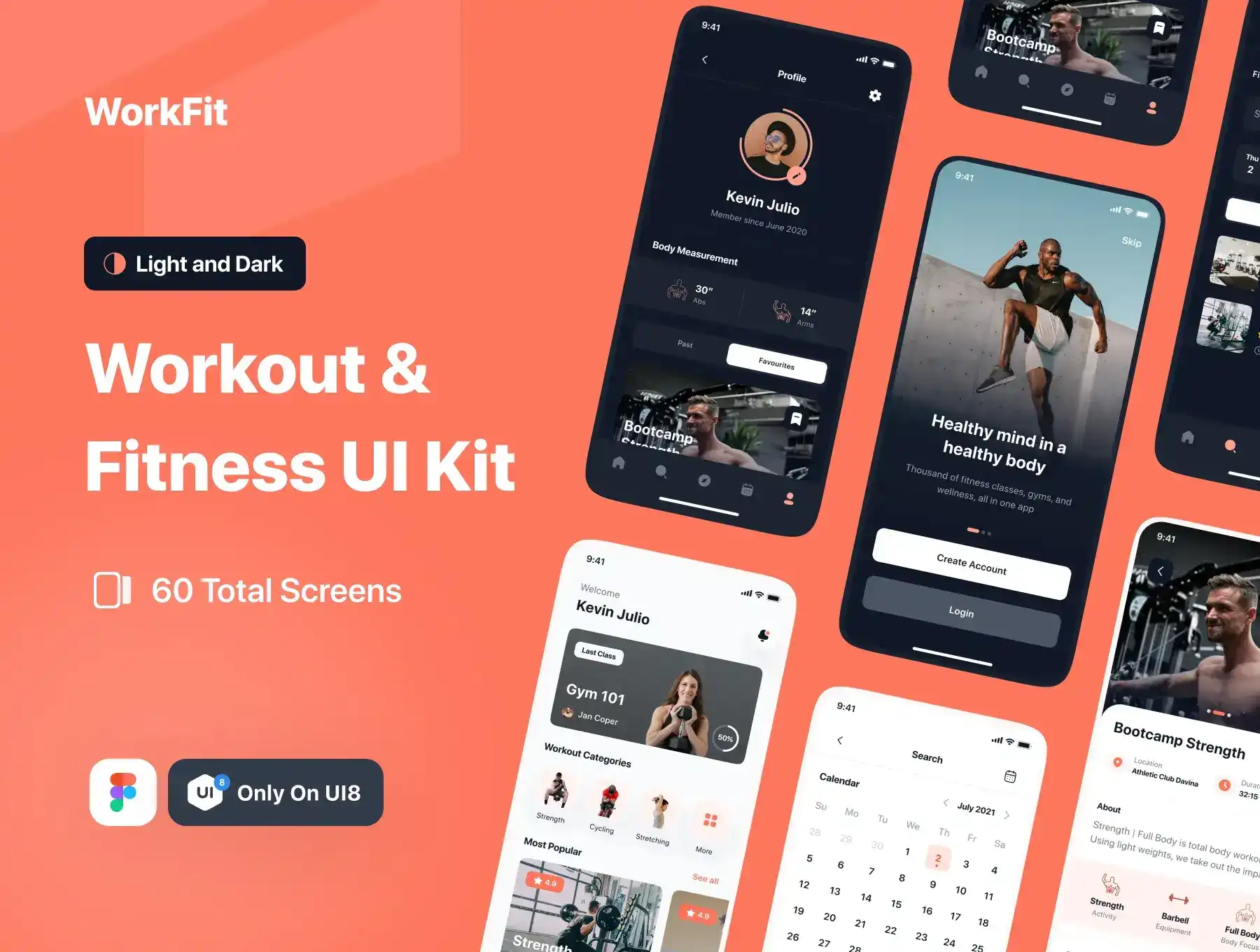 Workfit is a Workout & Fitness App UI Kit consisting of 60+ pixel-perfect screens and easy to use in Figma.
