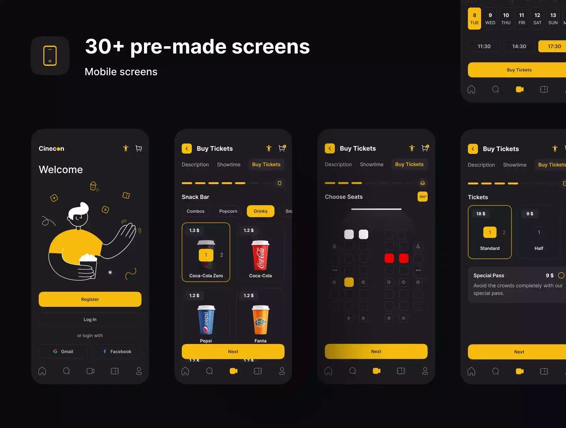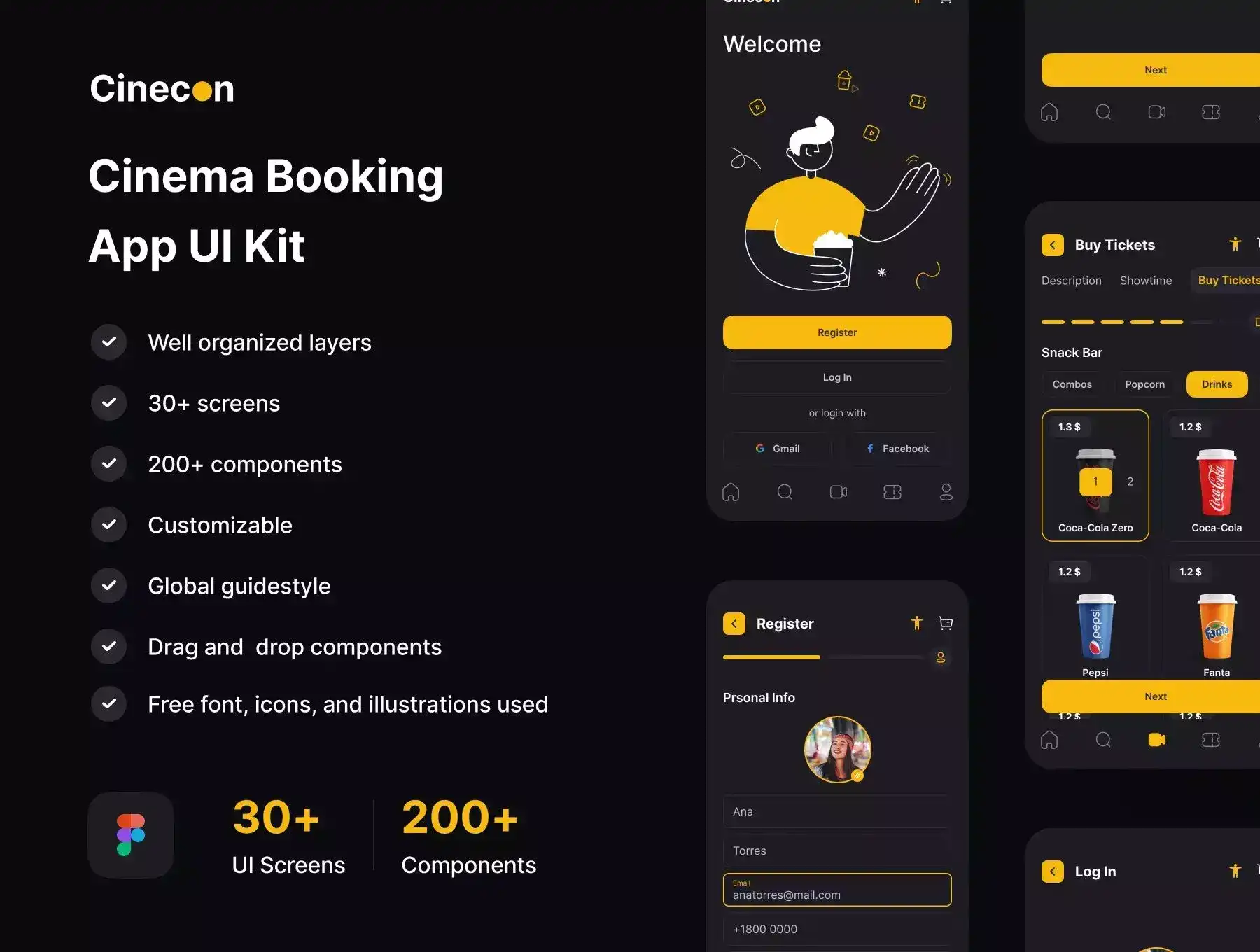 Cinecon is a cinema booking App UI Kit that includes 30+ carefully crafted mobile app screens and 200+ components. The kit is customizable to your style and it leverages all Figma features, including global color, font styles, dynamic components, and variants.