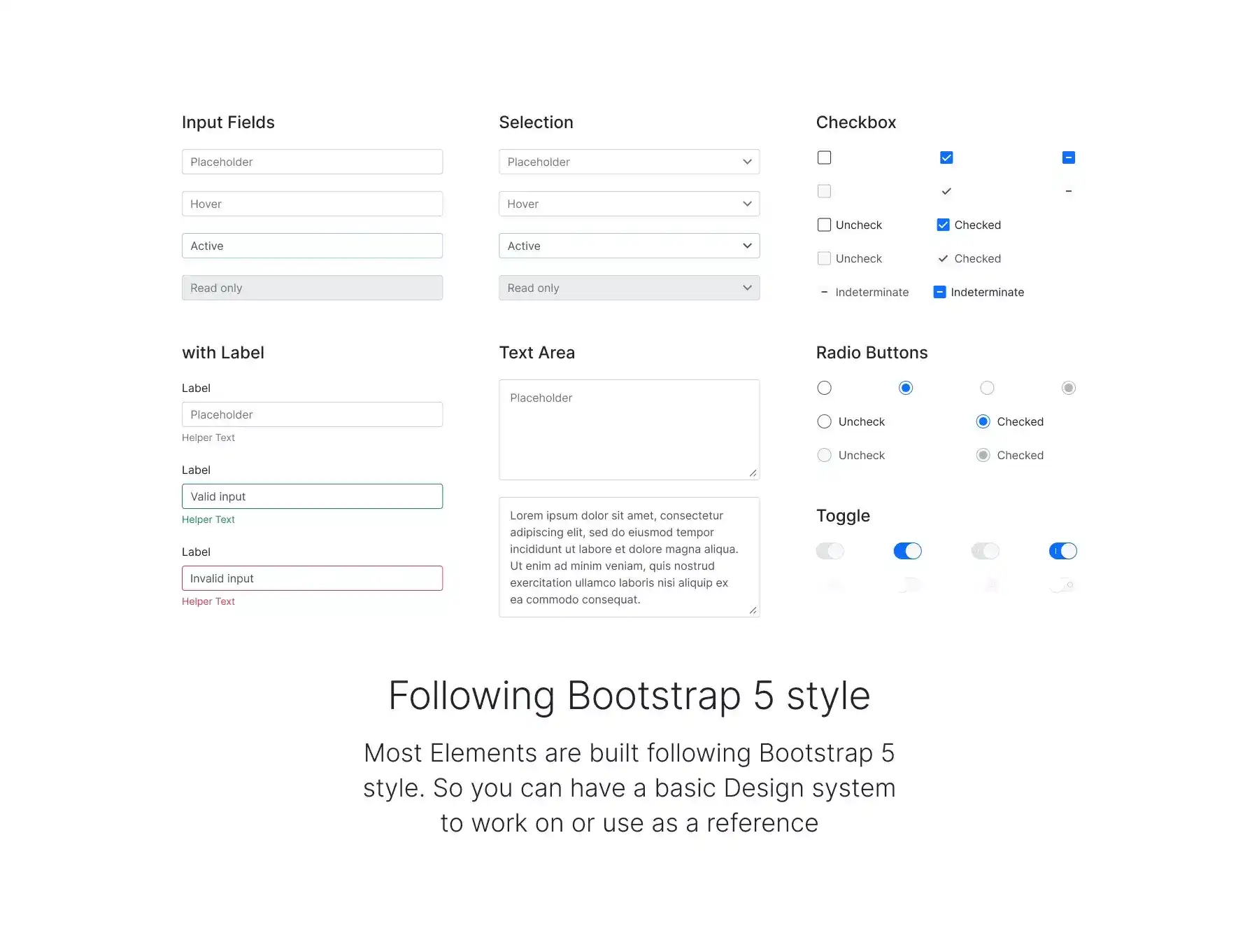 My team has to work with bootstrap on many projects. So in order to save design time, we decided to build an (almost) complete Bootstrap 5 design system.