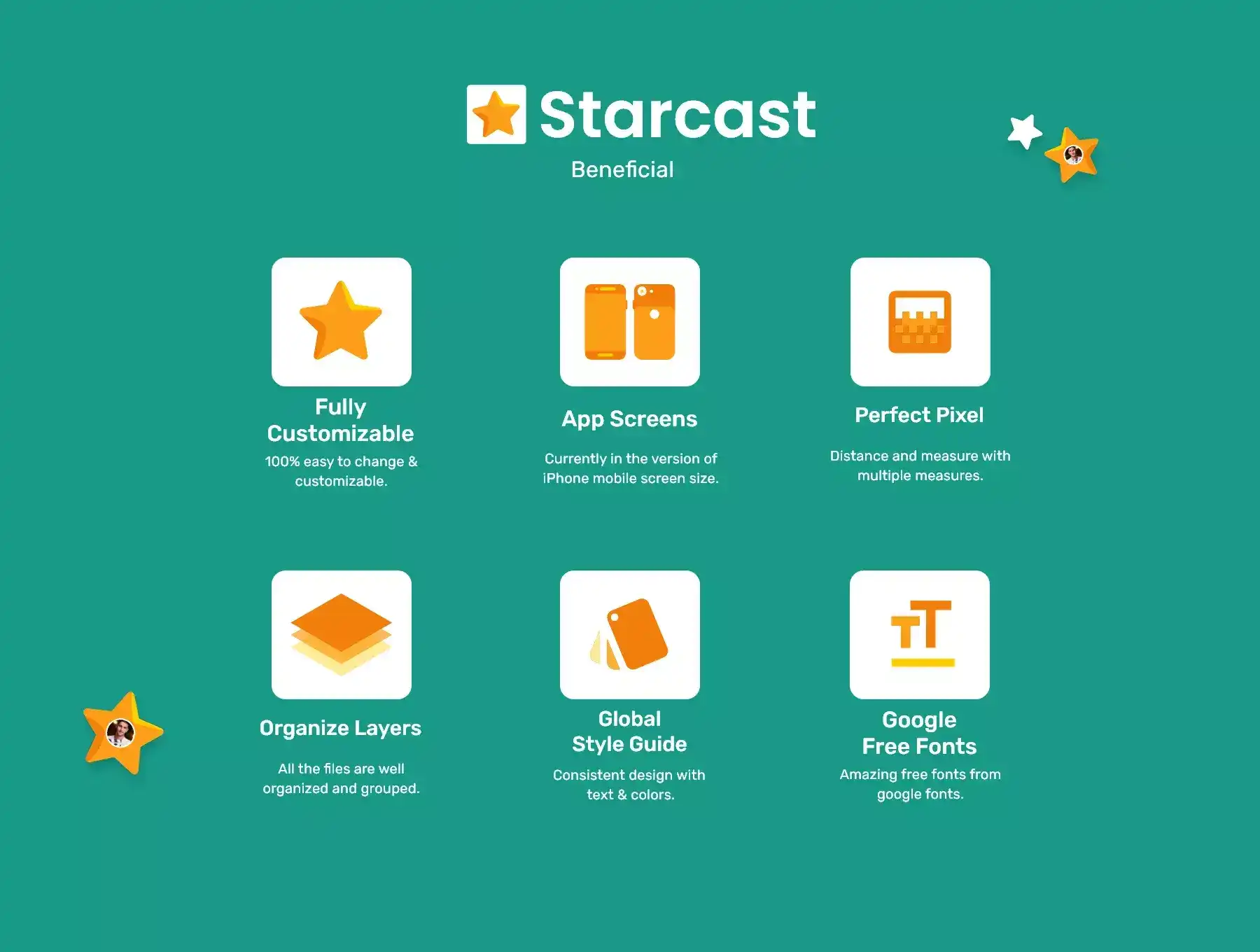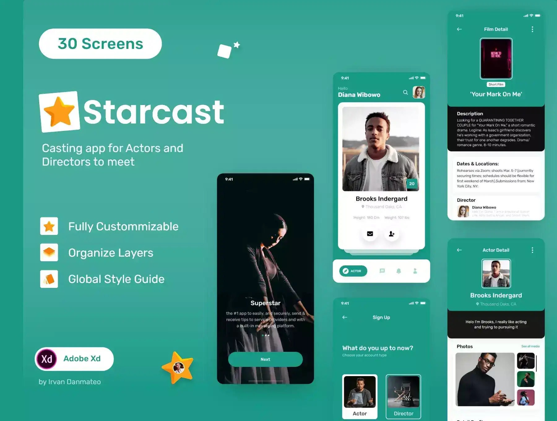 Starcast Casting App UI Kit that includes 30+ uniquely crafted mobile app screens. The kit is customizable to your style including global color, font styles, dynamic components, and variants.