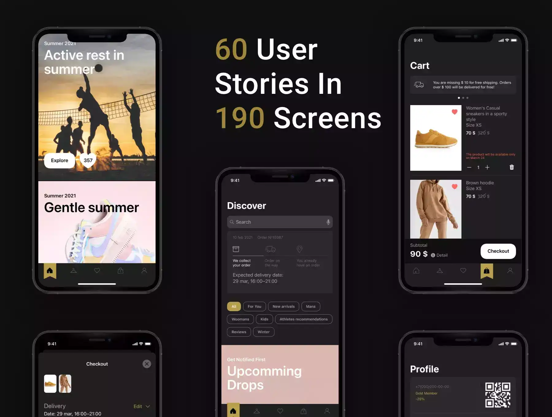 Sport Wear Shop Product UI Kit — 190 mobile ui compositions, based on real requirements, research & user stries. UI KIt will increase your productivity and allow you to create new and complex user interface compositions and of course, it will offer thoughtful scenarios based on real requirements and research, you will find many insights for yourself.