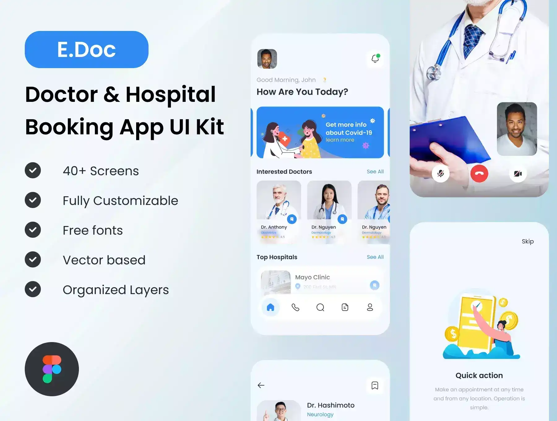 E.Doc UI Kit is also brilliantly designed, with great care and attention to detail. There are 40+ high-quality screen templates included, all created in Figma. This modern design template is simple to edit, making designing your next app even simpler!