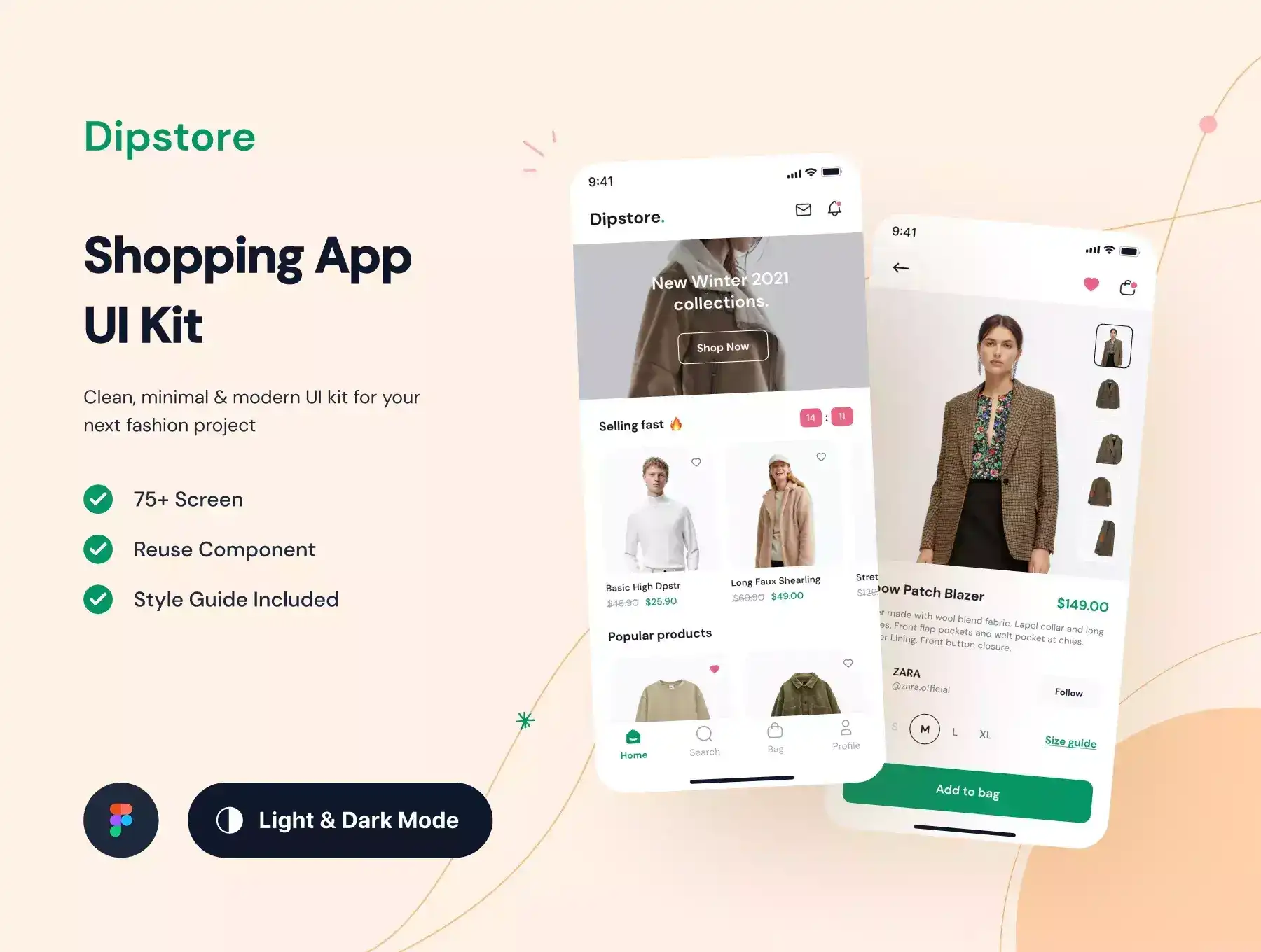 Dipstore is a Premium Shopping App UI Kit consisting of 75+ pixel-perfect screens and easy to use in Figma.