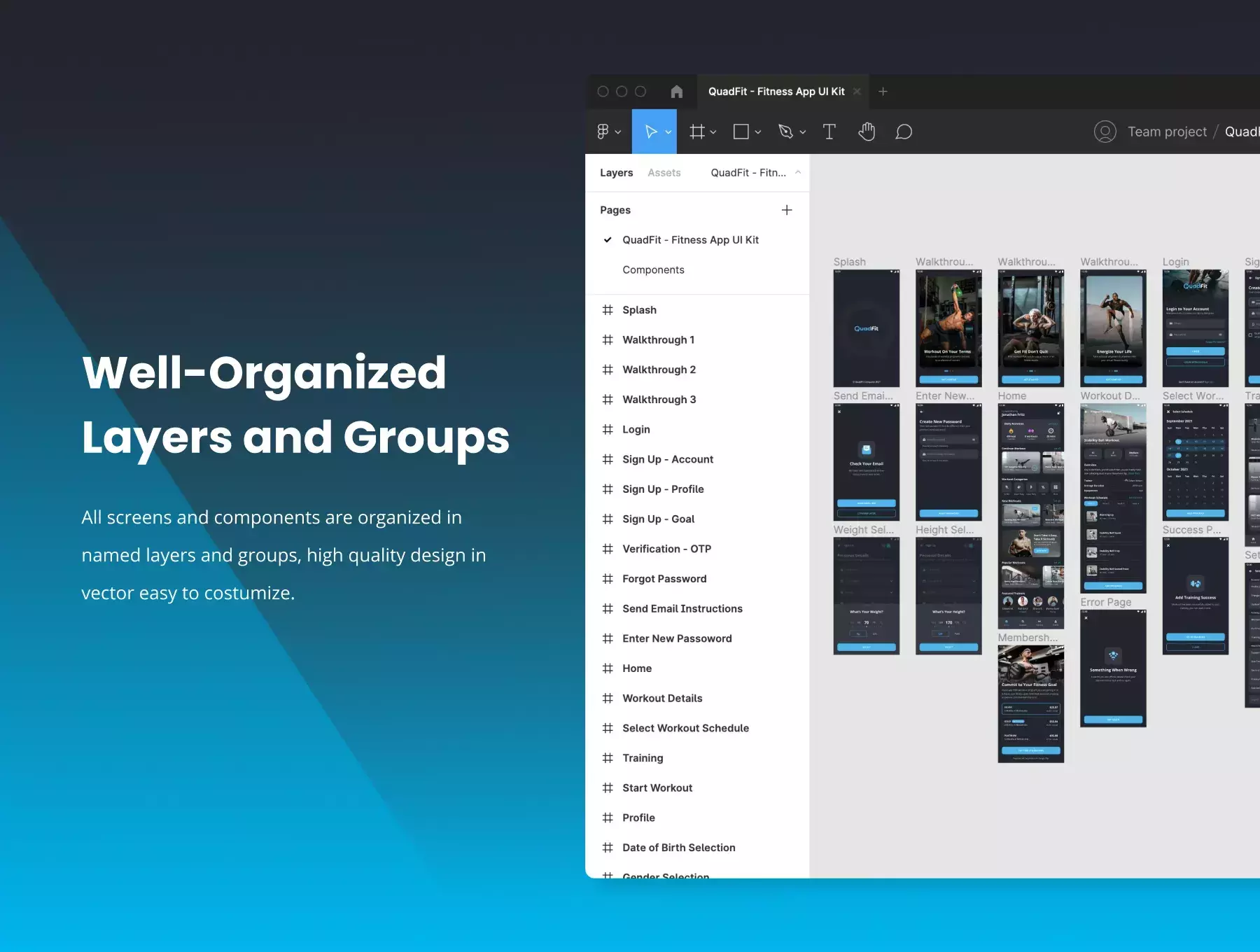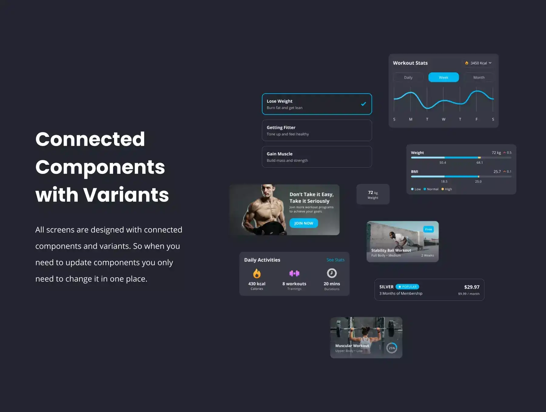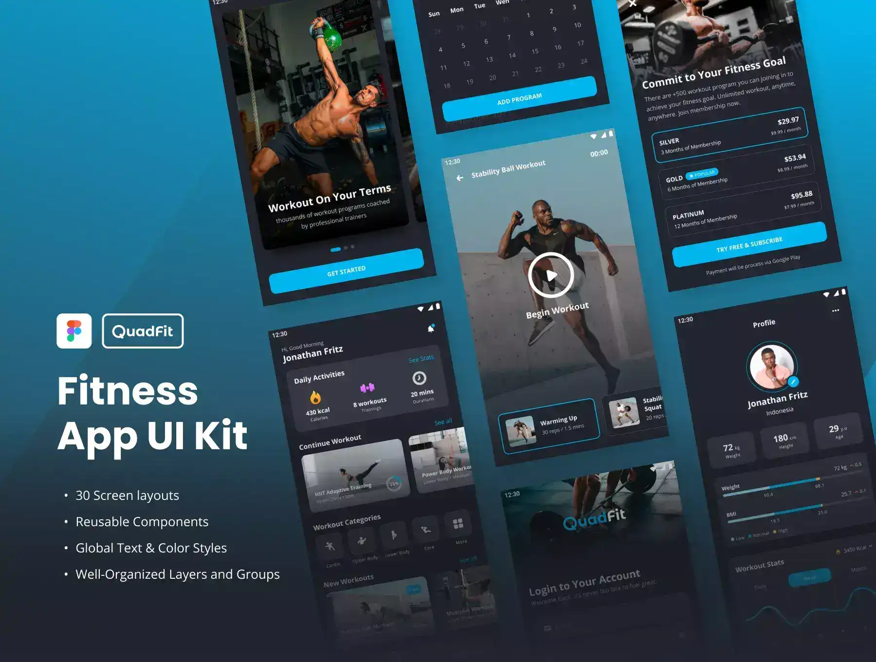 QuadFit is a Fitness App UI Kit designed in Figma with a reusable component, auto-layout, text & color styles, and well-organized layers. With 30 screens, components, and icons, this mobile app UI Kit is very suitable for you to help your workout or fitness design app project.