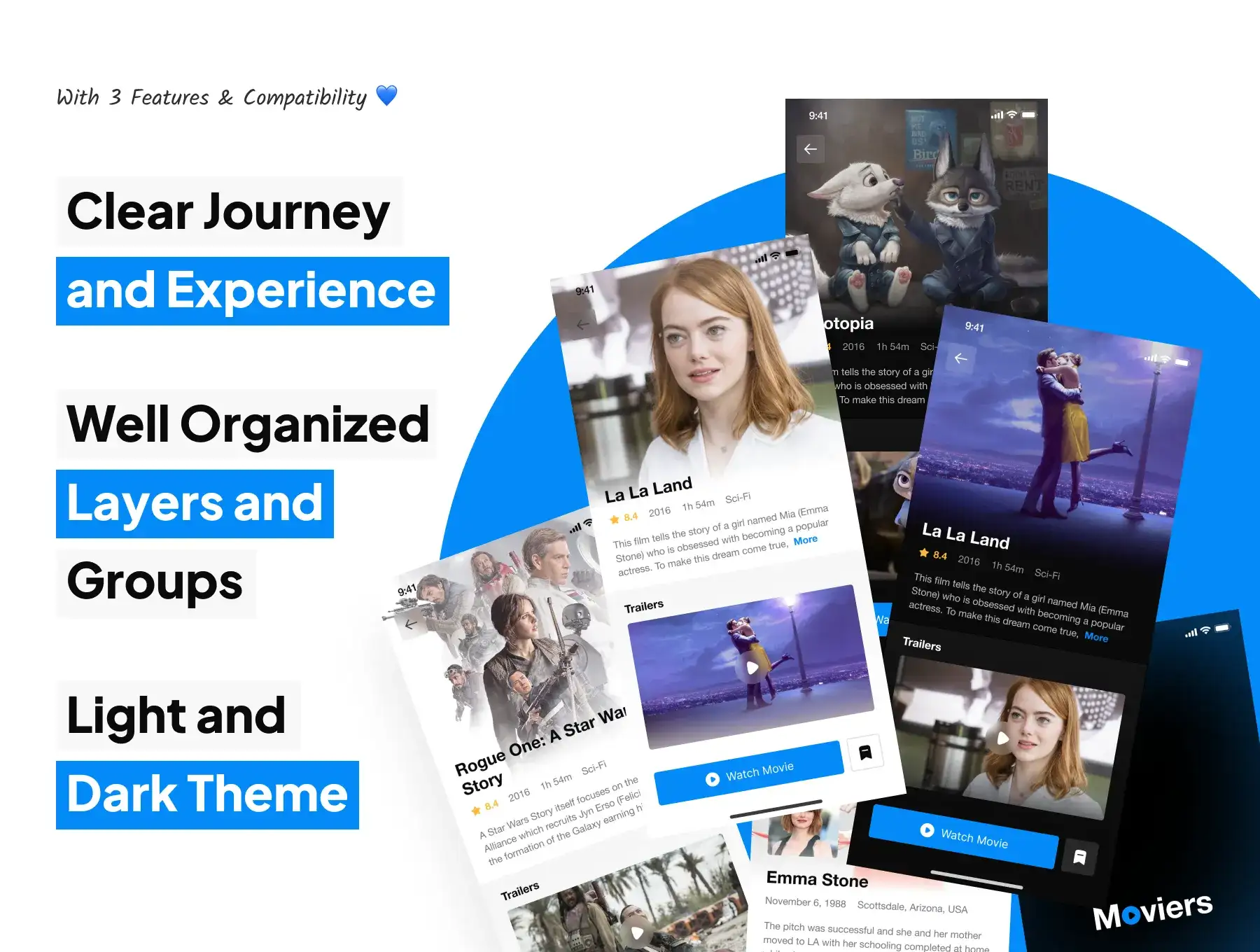 Moviers is a Premium and High-Quality Movie Streaming App UI Kit with 102 high-quality screens and easy to use in Figma. Available in Light & Dark theme.