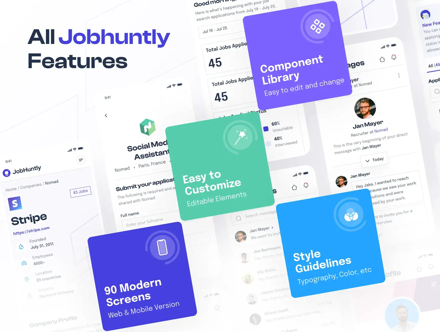 Jobhuntly Web and Mobile UI Kit will help your Job Board & Portal App products or services. Came with clean and professional style, you can easily edit and customize all elements with a design component that can speed up your design process.