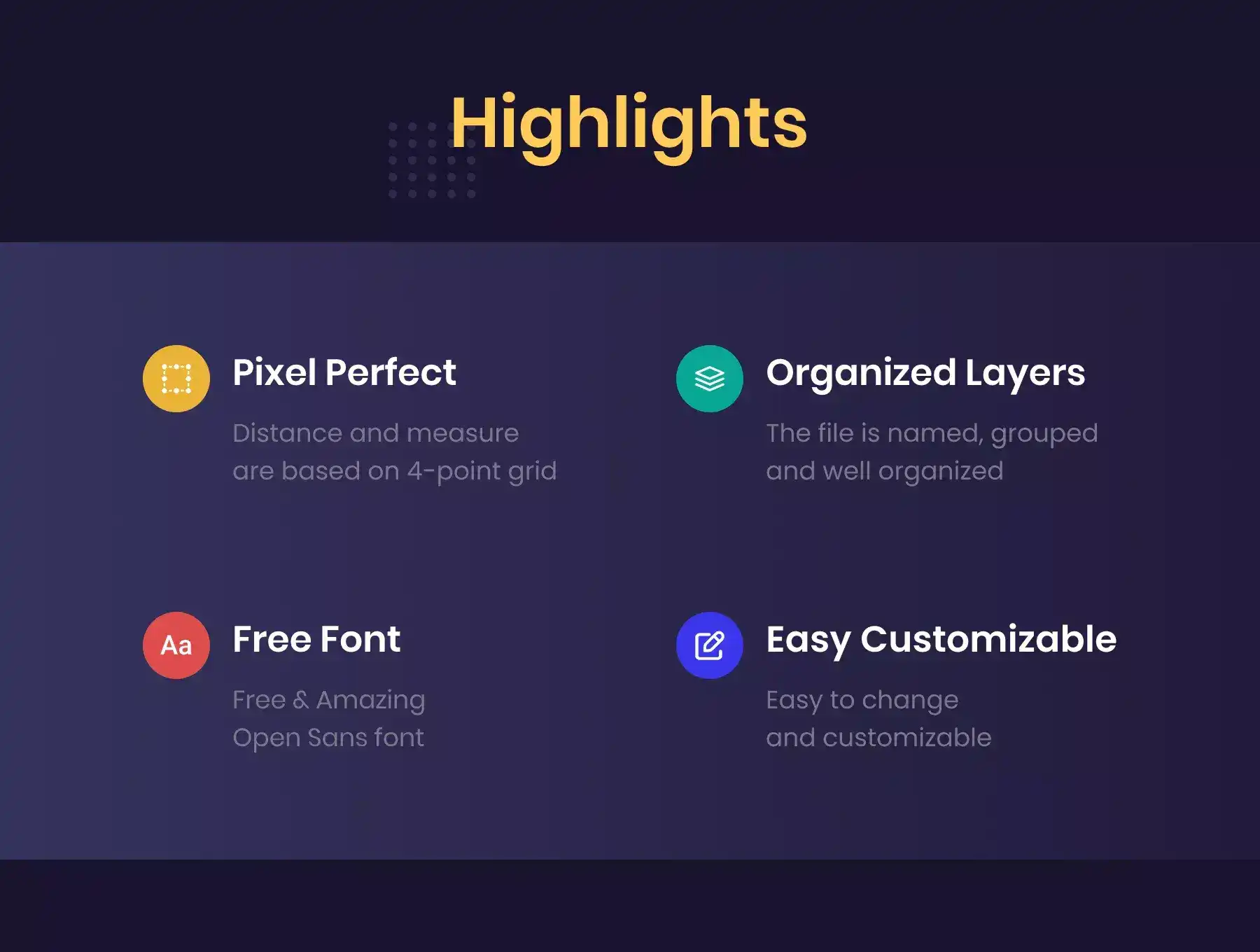 Every screen was designed to be simple and striking. It includes fully customizable components based on vector. We use the 4-8px design grid to ensure precise execution at every turn. All layers are well-organized that will accelerate your design process.