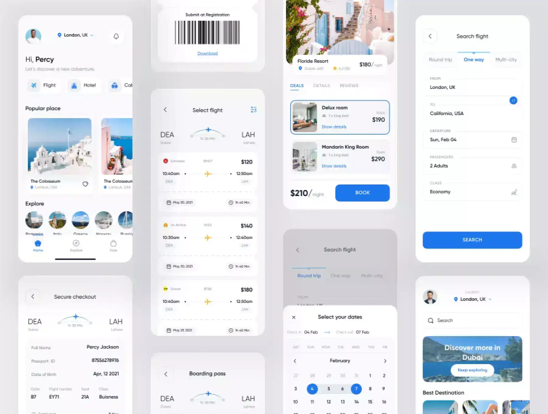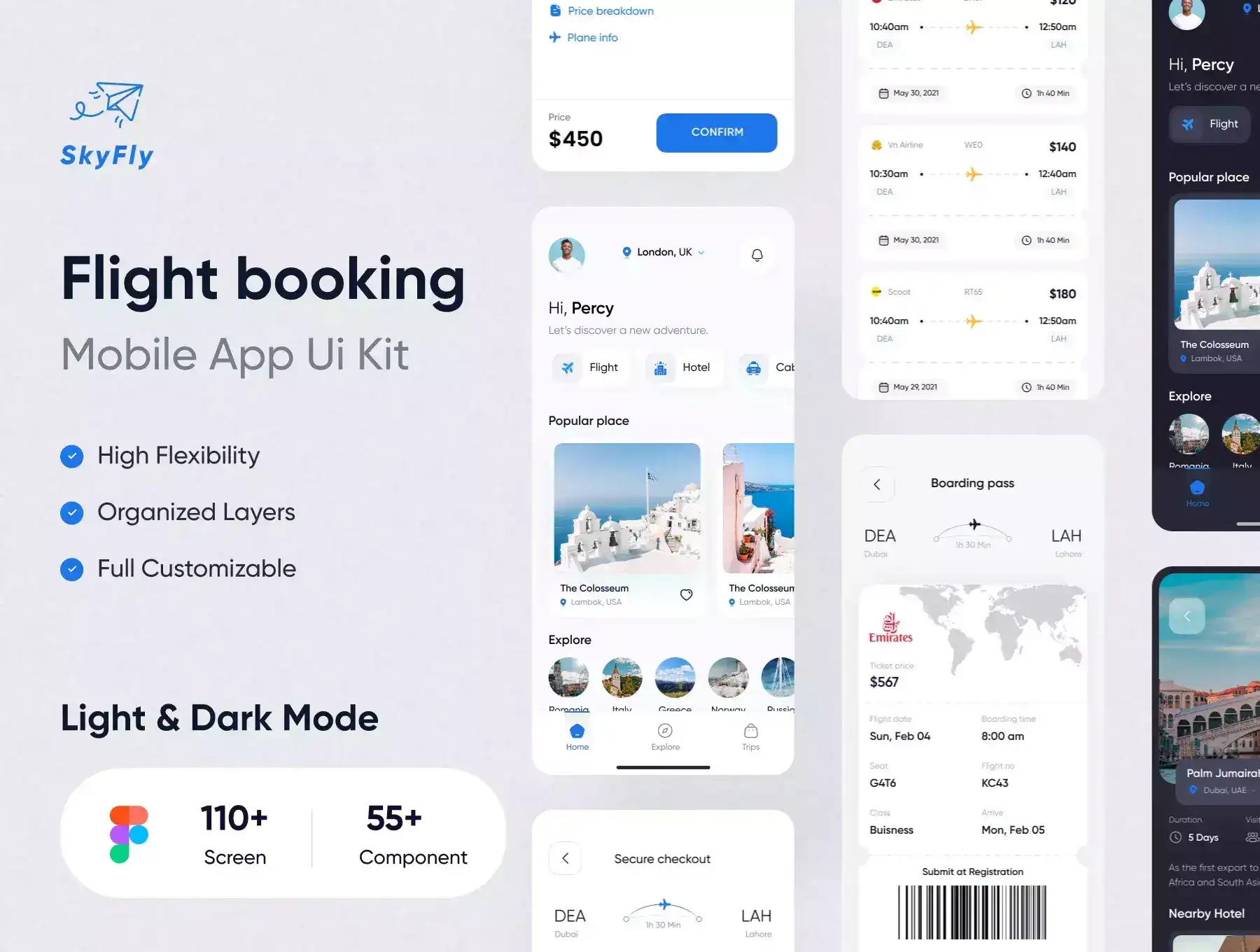 Skyfly is an airplane ticket purchasing UI Kit that takes you through the entire process of buying a plane ticket. From the initial destination search to the moment you have to board the plane. This kit can be customized to your project needs not only for flight booking projects but for any app that follows similar flows. It also have flow like hotel booking, cab booking.
