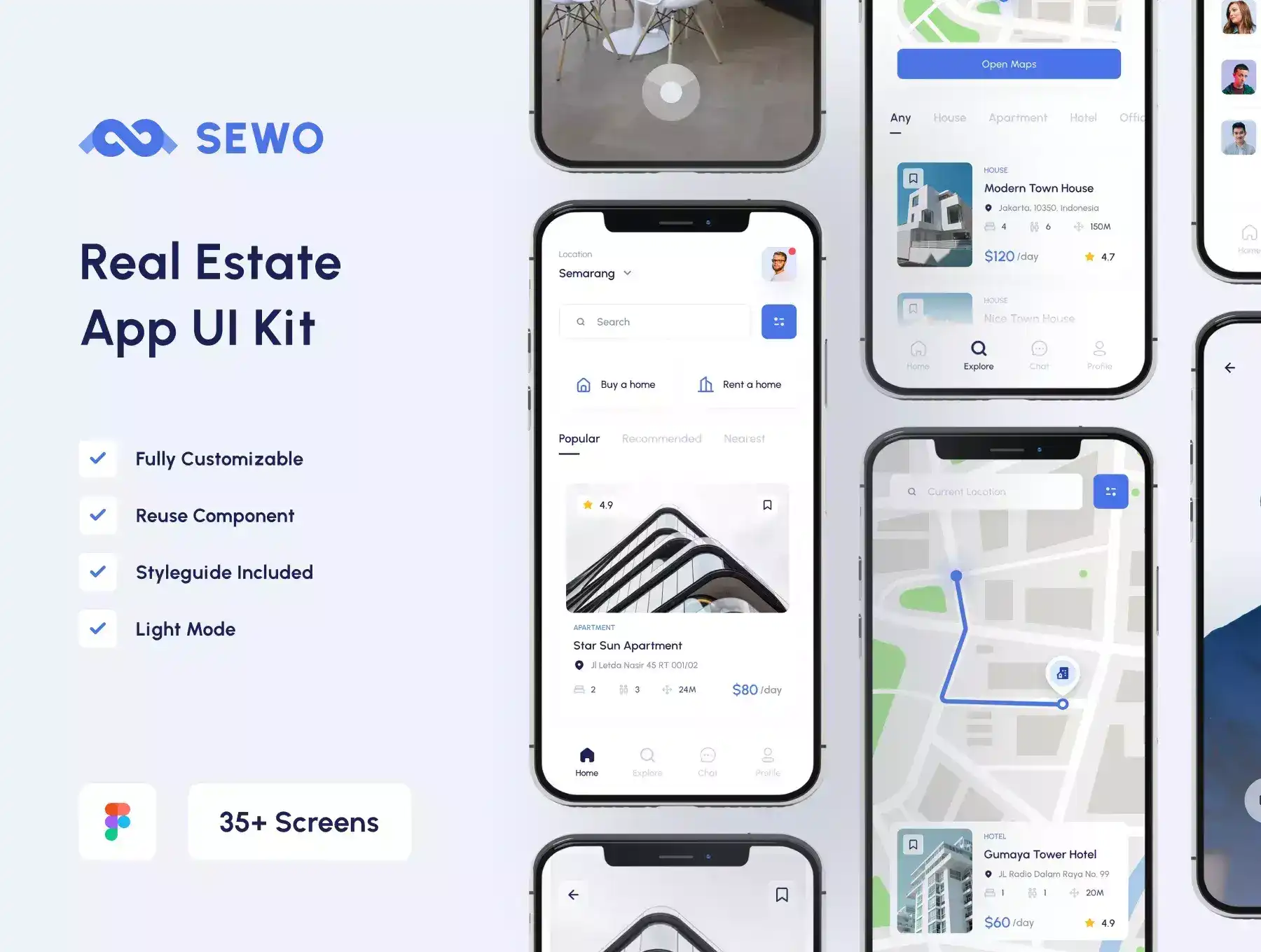 Sewo is a real estate mobile app UI Kit with a clean, neat, and modern style that contains 30++ high-quality screens. Available in light mode and easy to use in Figma.
