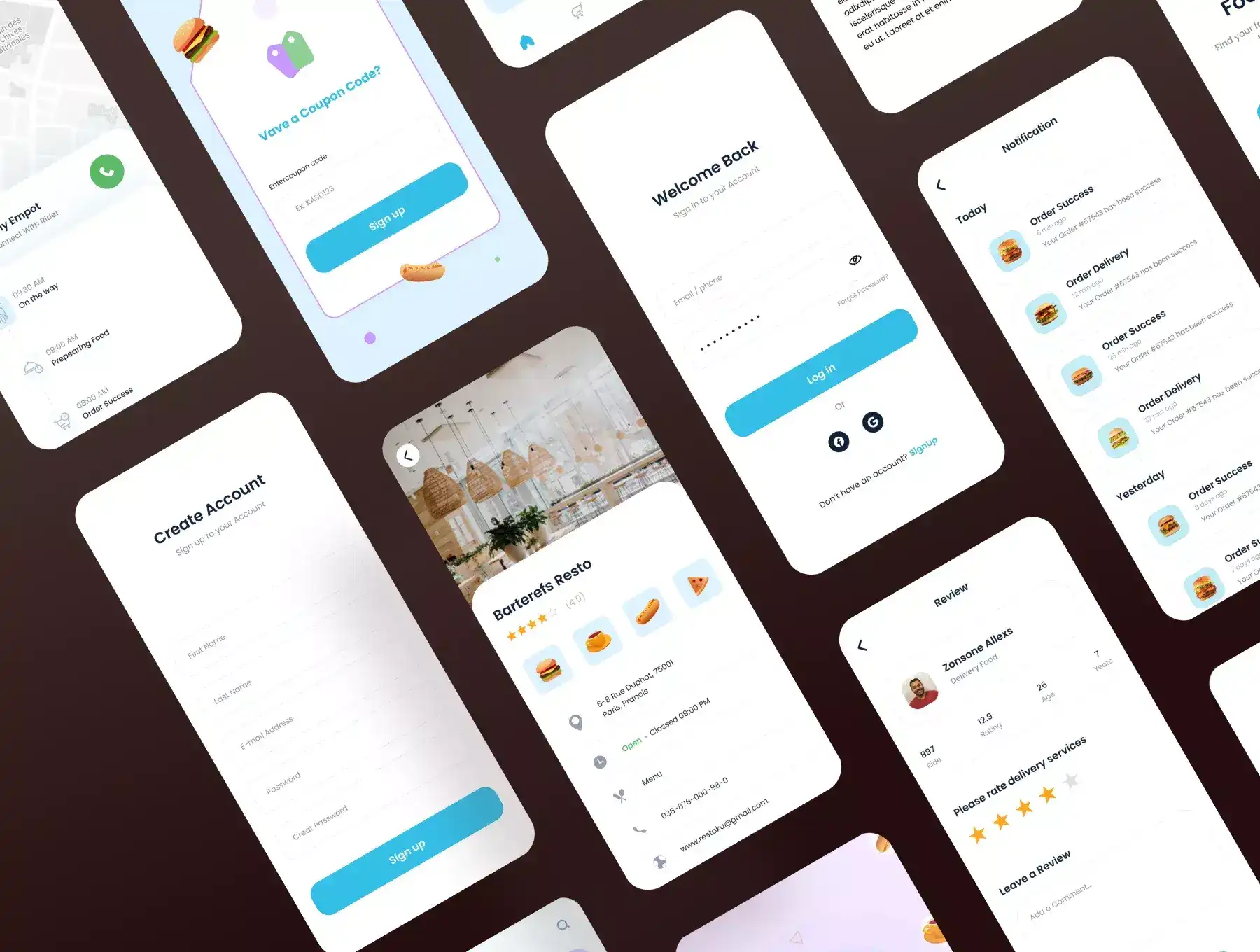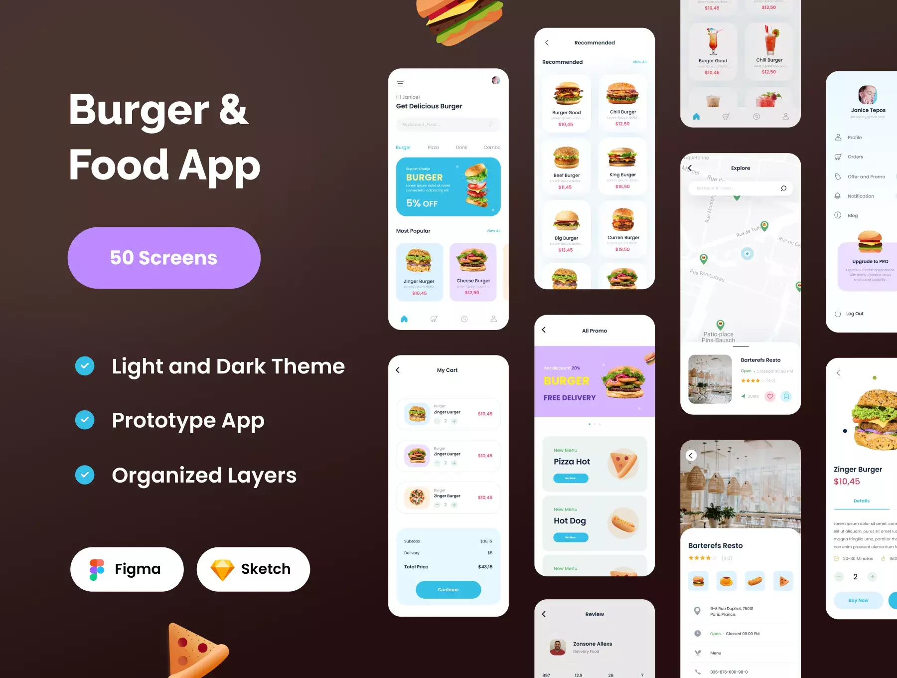 Food Burger App is a Premium and High-Quality for order burger with application. We have 50 high-quality screens and editable to use in Figma and Sketchapp. Also Available in Light & Dark theme.