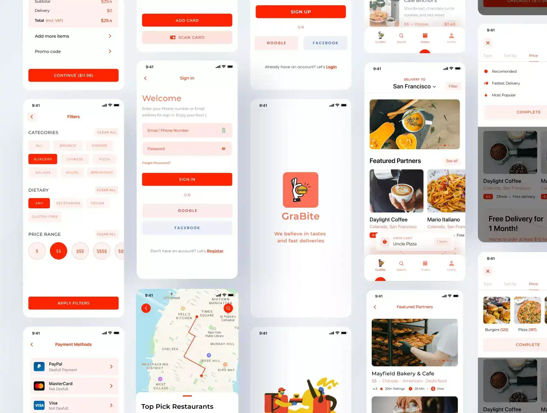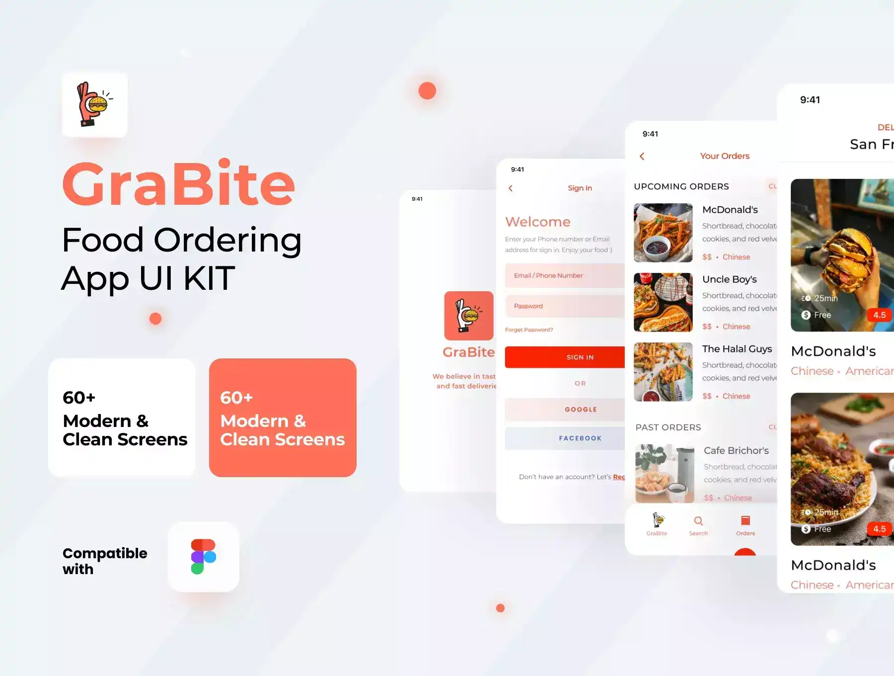 GraBite is a Premium and High-Quality Food Order & Delivery App UI Kit with 60+ HQ screens and easy-to-use in FIGMA Designs crafted with Love and more focused on UX-friendliness.