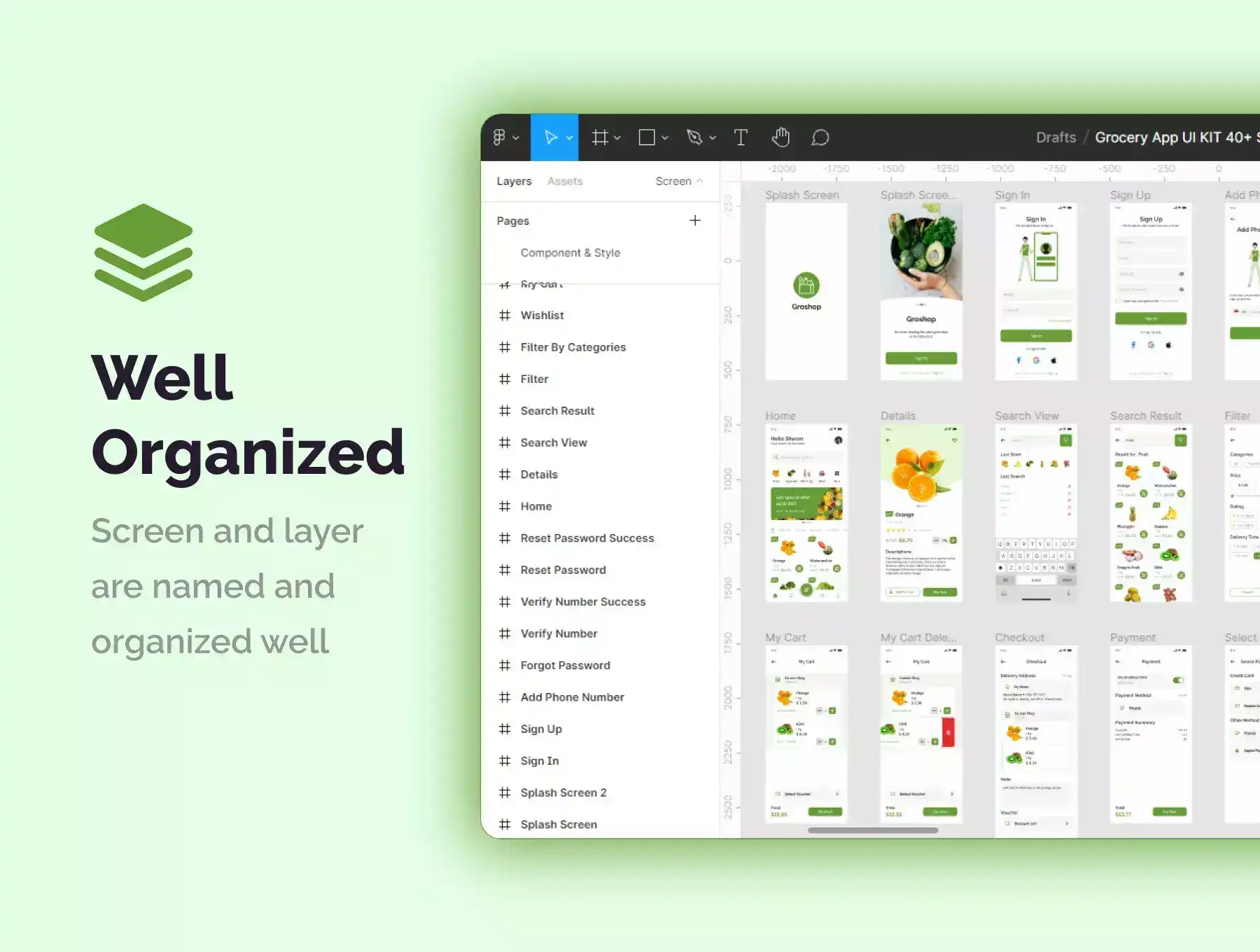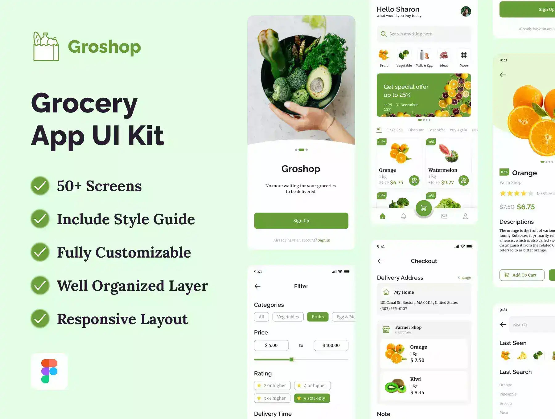 Groshop is a Premium Grocery app UI Kit consisting of 50+ pixel-perfect screens and easy to use in Figma.