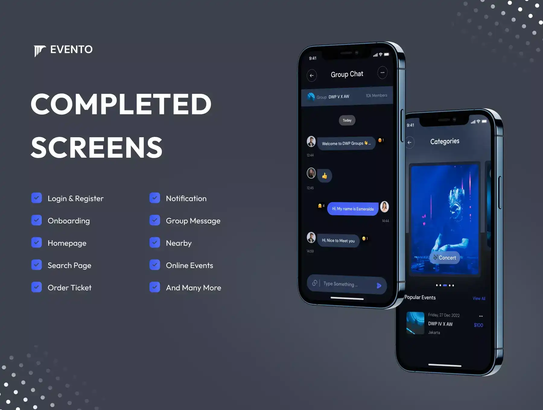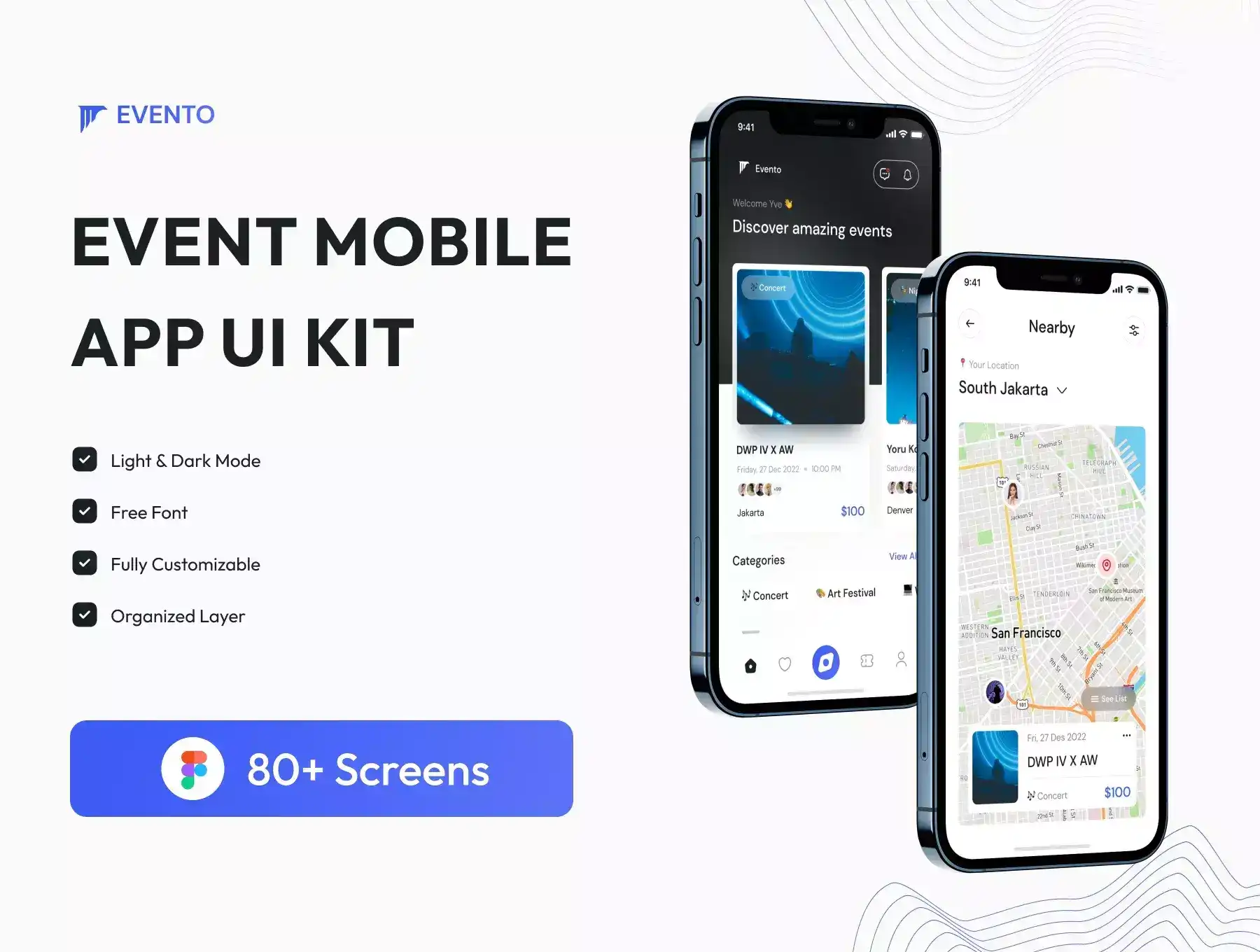 Evento is an Event Mobile App UI Kit with 80++ high-quality screens and is easy to use with clean, neat, and modern design. Available Light & Dark theme in Figma file.