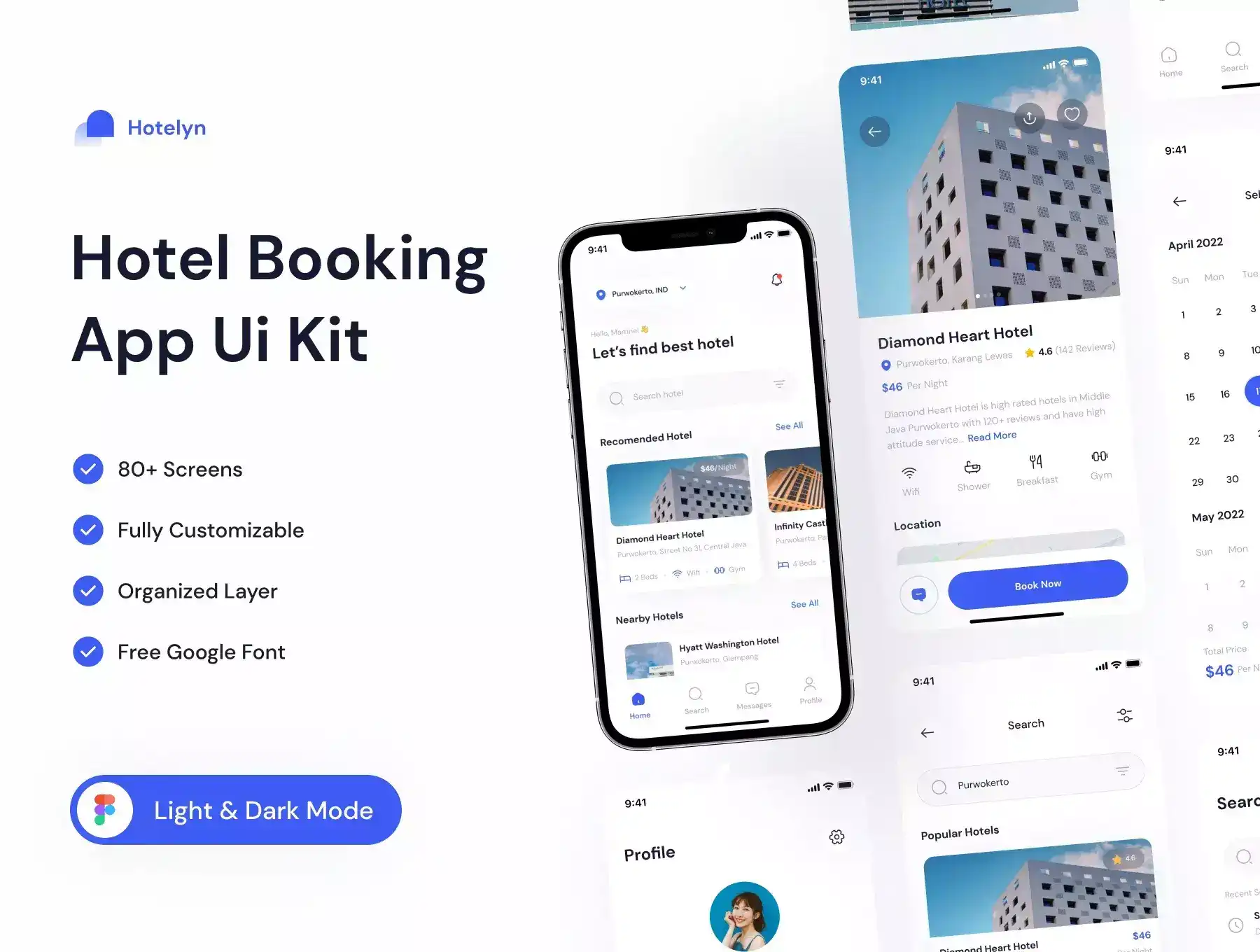 Hotelyn is a Hotel Booking Mobile App UI Kit with 80++ high-quality screens and is easy to use with a clean, neat, and modern design. Available Light & Dark theme in Figma file.