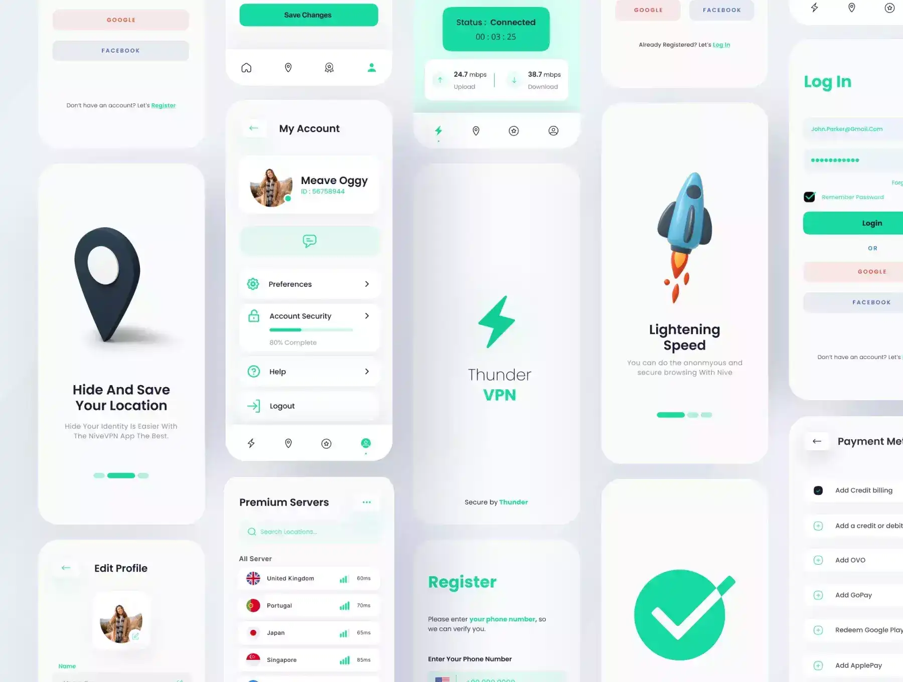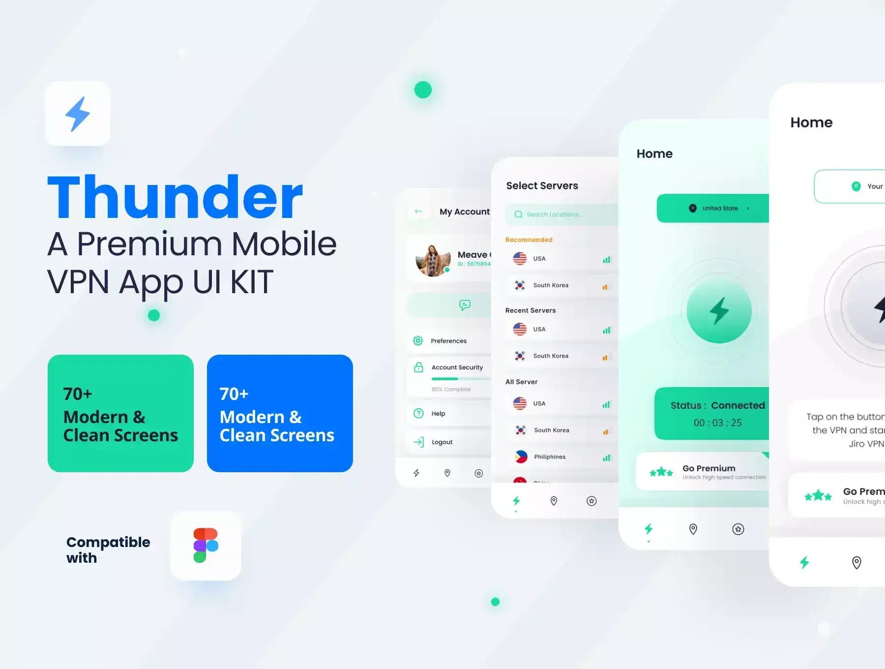 Thunder is a Premium and High-Quality Mobile VPN App UI Kit with 70+ HQ screens and easy-to-use in FIGMA Designs crafted with Love and more focused on UX-friendliness.