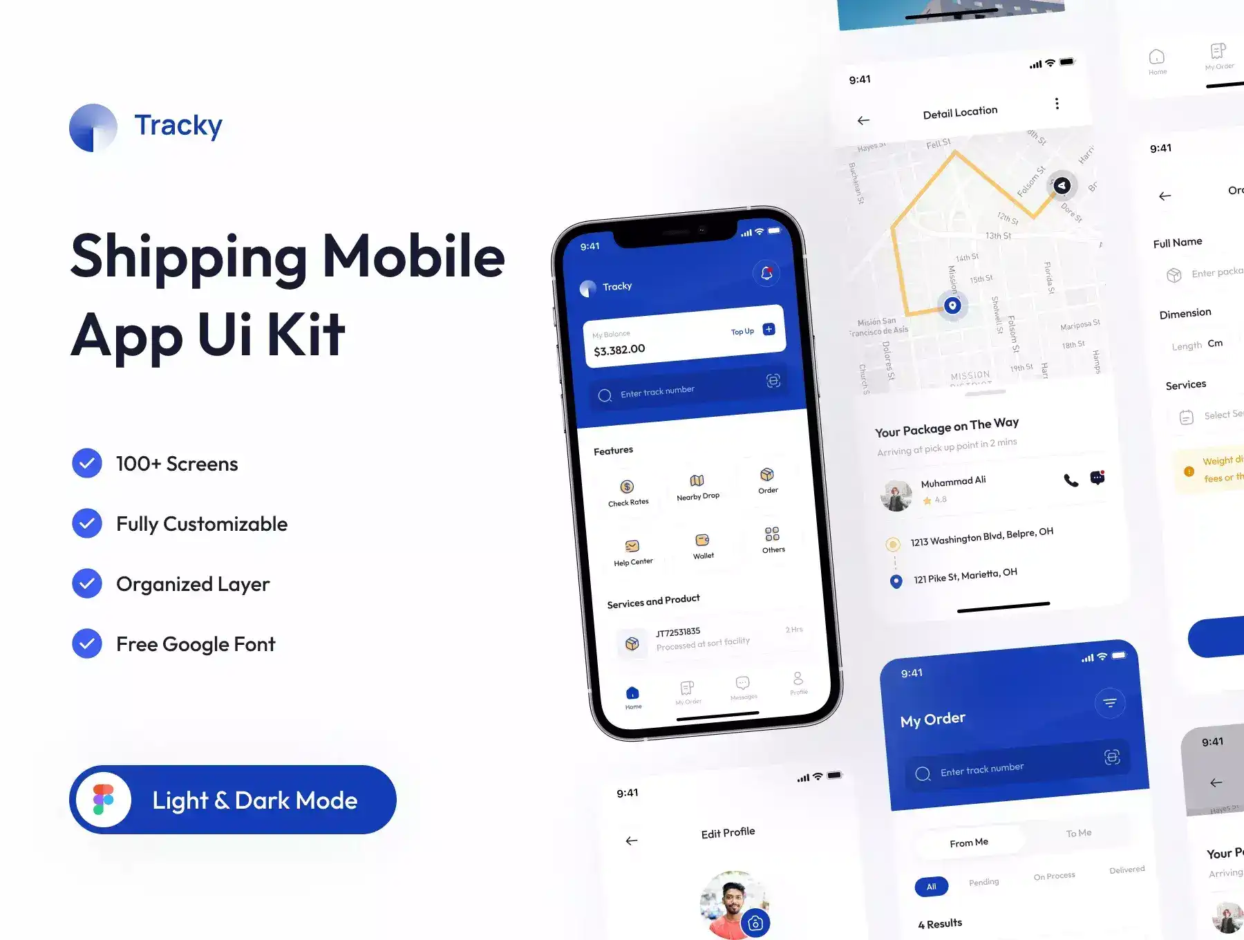 Tracky is a Shipping Mobile App UI Kit with 100++ high-quality screens and is easy to use with a clean, neat, and modern design. Available Light & Dark theme in Figma file.