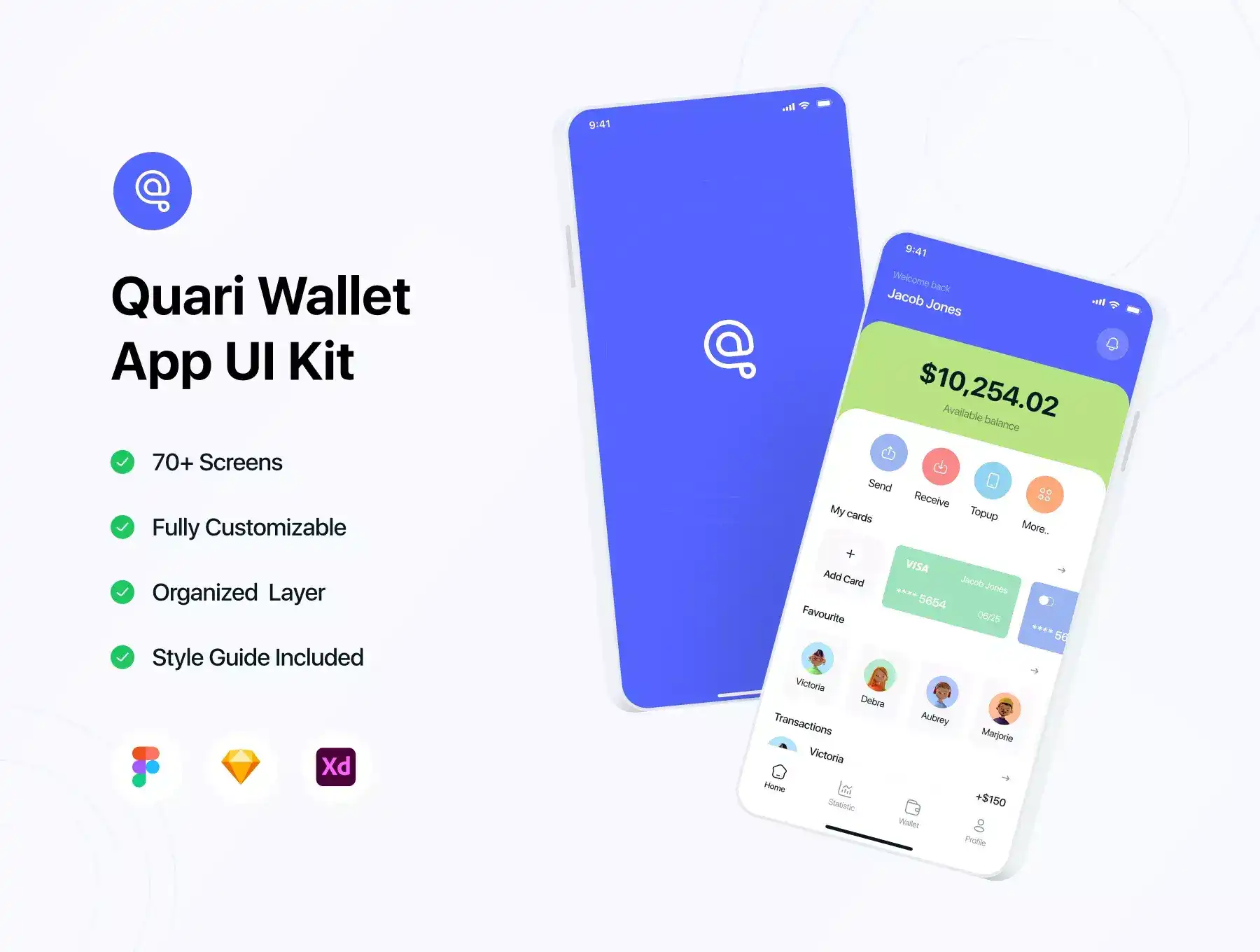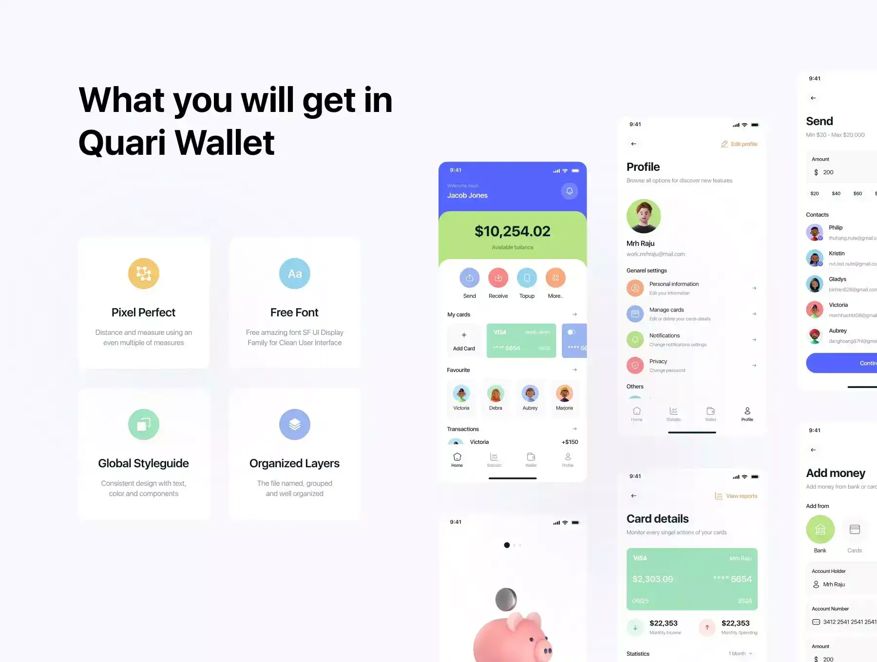 Quari Wallet is a Premium Mobile Wallet App UI Kit consisting of 72 pixel-perfect screens and is easy to use in Figma. The kit is easy to fully customize to your liking and it leverages all Figma features, including global color, font styles, dynamic components.