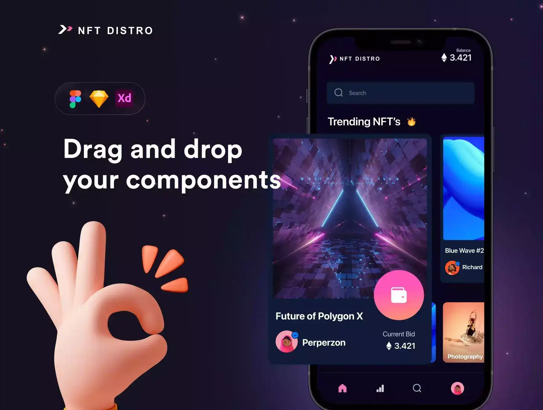 NFT Distro, a Fully Customazable UI Design kit for NFT Market, including exclusive design files, beautiful color, and design system in Figma, Sketch and Adobe XD.