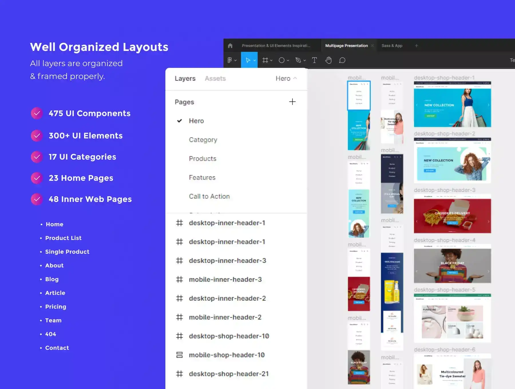 It includes 475 UI Components, 300+ UI Elements, 17 user interface categories, 70+ web pages, and many more features.The Figma E-commerce UI kit is built with an atomic design system & auto layout. Furthermore, you can also use the Assets panel to jumpstart your next Figma project by simply dragging and dropping pre-made components. You can customize them on the right sidebar. As it should be, it's quick and easy.