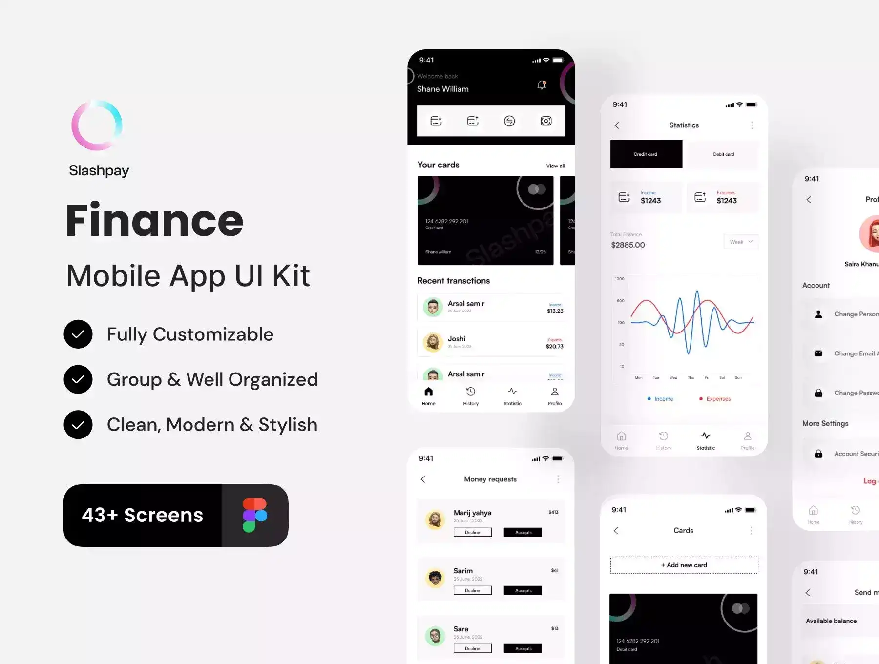 Slashpay is a high-quality UI Kit for Wallet & Finance apps, Crypto Wallets, and E-Wallet, Smart Finance apps & Bank app with a pack of 43+ professional app screens including exclusive design files and beautiful illustrations editable in Figma