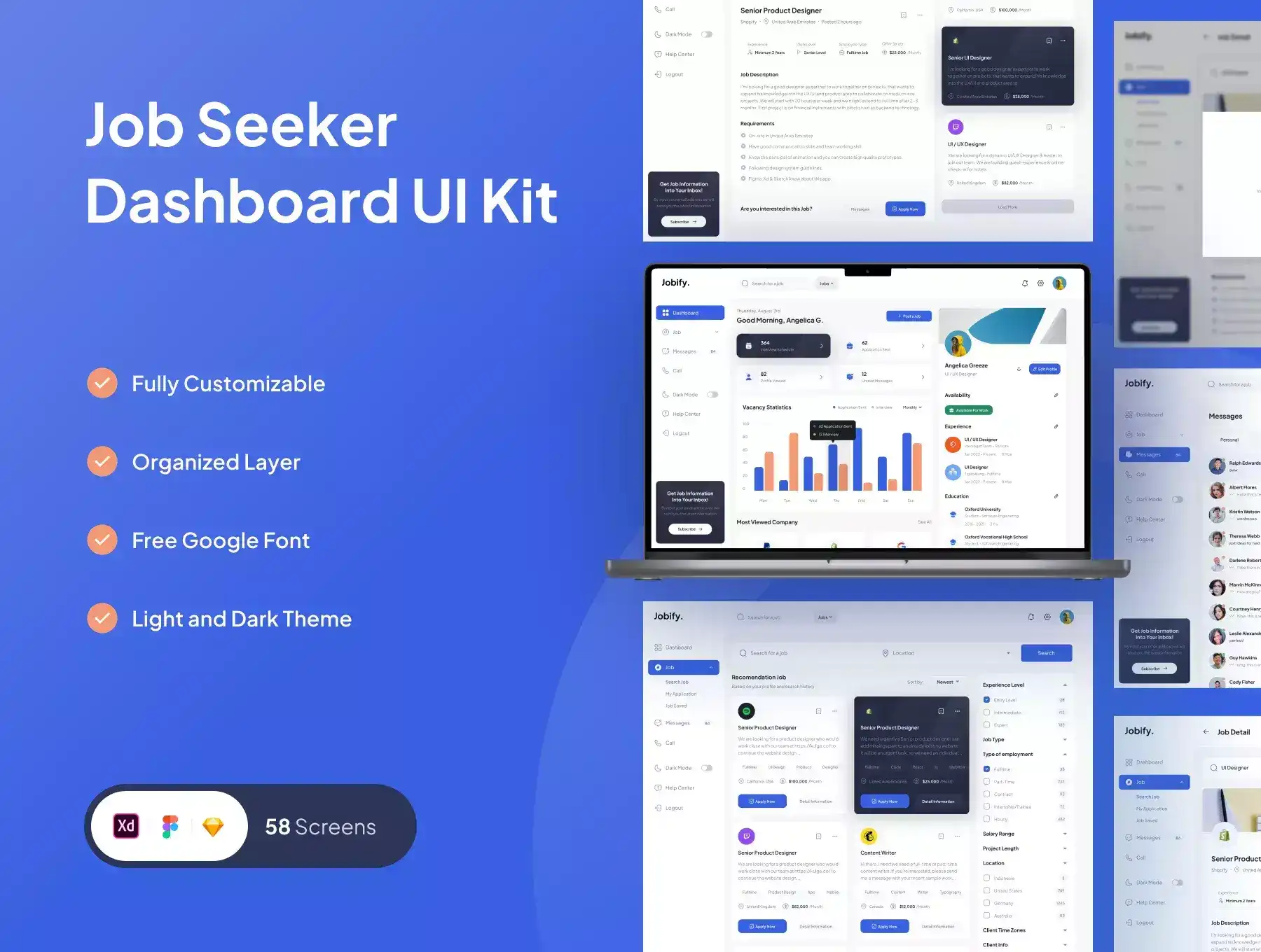 Jobify is an Job Seeker Dashboard UI Kit with 58 high-quality screens and is easy to use with clean, neat, and modern design. Available Light & Dark theme in Adobe XD,Figma,Sketch file.