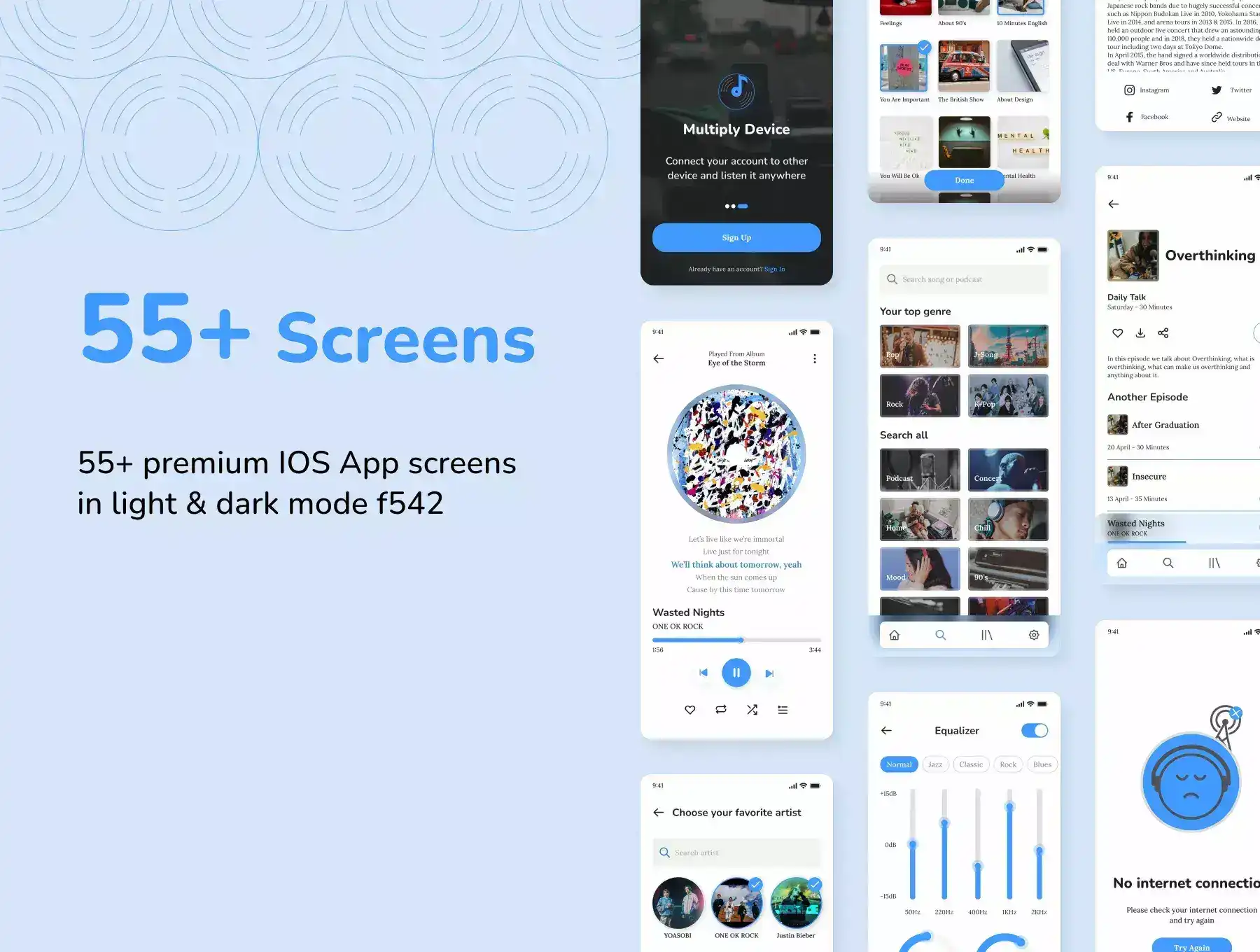 Ongaku is a Premium Music & Podcast app UI Kit consisting of 55+ pixel-perfect screens and easy to use in Figma.