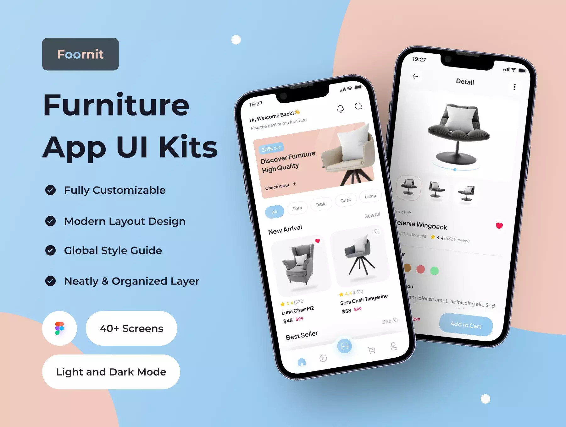 Foornit is 40+ stylish mobile screens UI Kit for Decorate, Interior, eCommerce, and have crucial parts for selling furniture goods platform. All components and screens are fully responsive so you can easily adapt to your desired screen sizes and also well documented. This UI kit has clear UX journey with reusable UI which can speed up the design process.