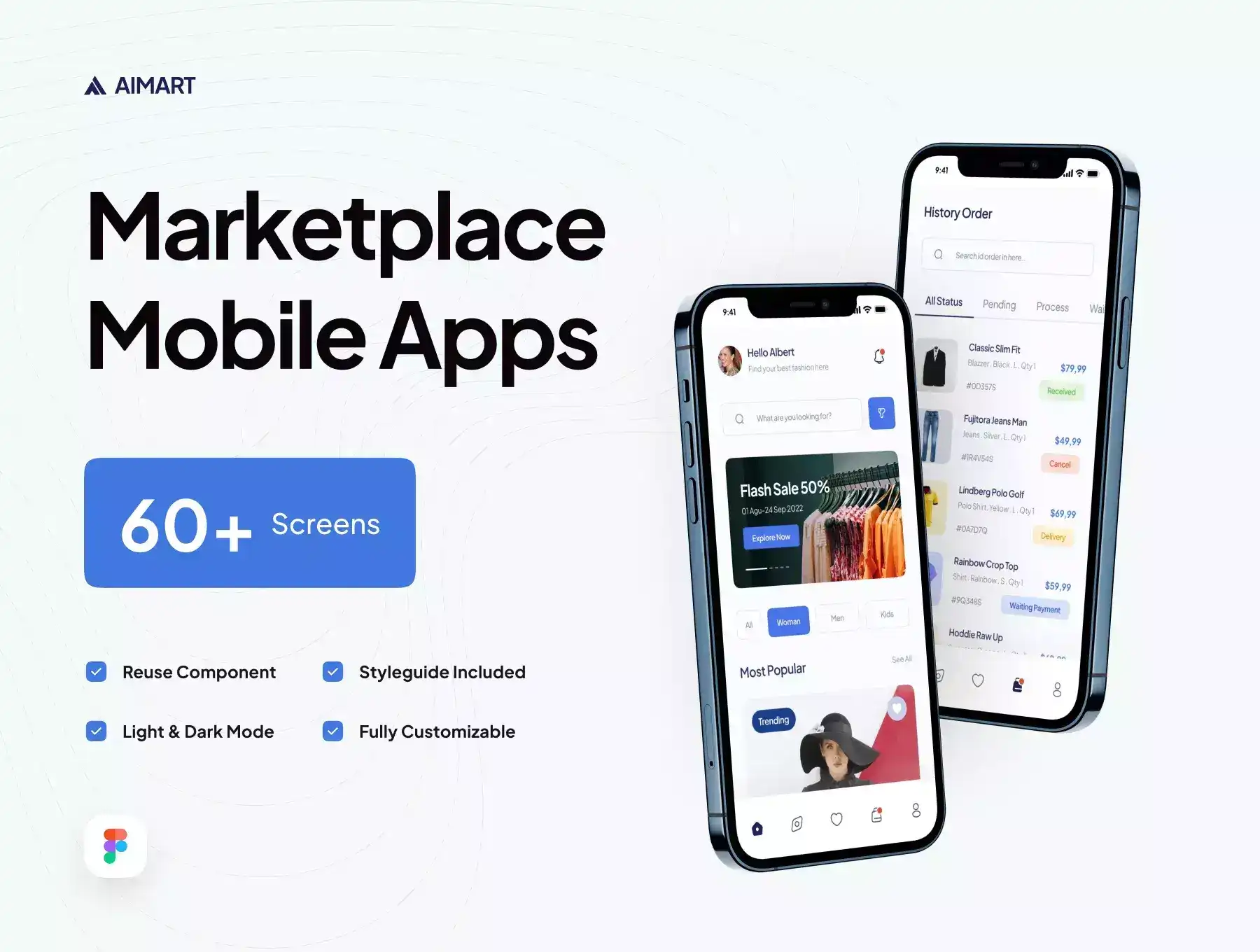 Aimart is marketplace mobile app UI Kit with clean, neat, and modern design. Aimart UI Kit contains 60+ high-quality screens with 30+ light mode and 30+ dark mode.