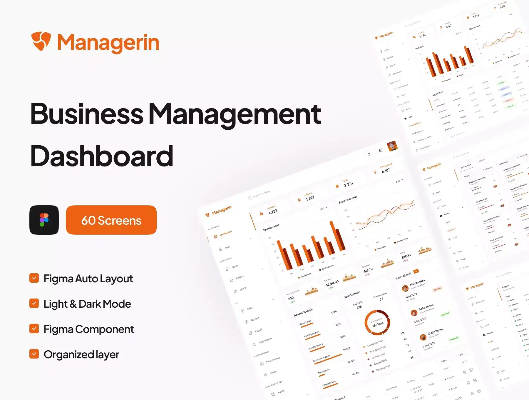 Managerin is business management dashboard UI Kit with clean, neat, and modern design. Managerin UI Kit contains 60 high quality screens with 30 light mode and 30 dark mode.
