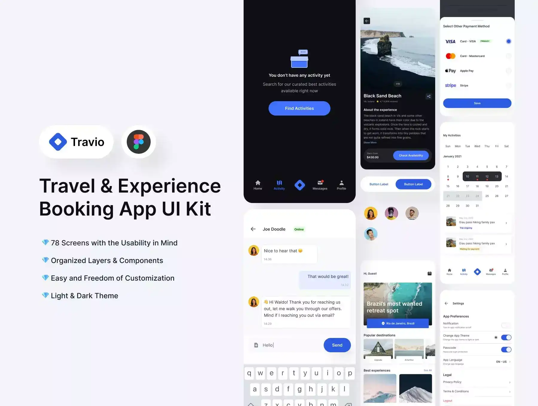 Travio UI Kit helps you swiftly generate from simple to complex designs for your travel & experience booking app. You can build your screens without limitations with 78 screens (each for light and dark themes) and 100+ components with usability in mind.