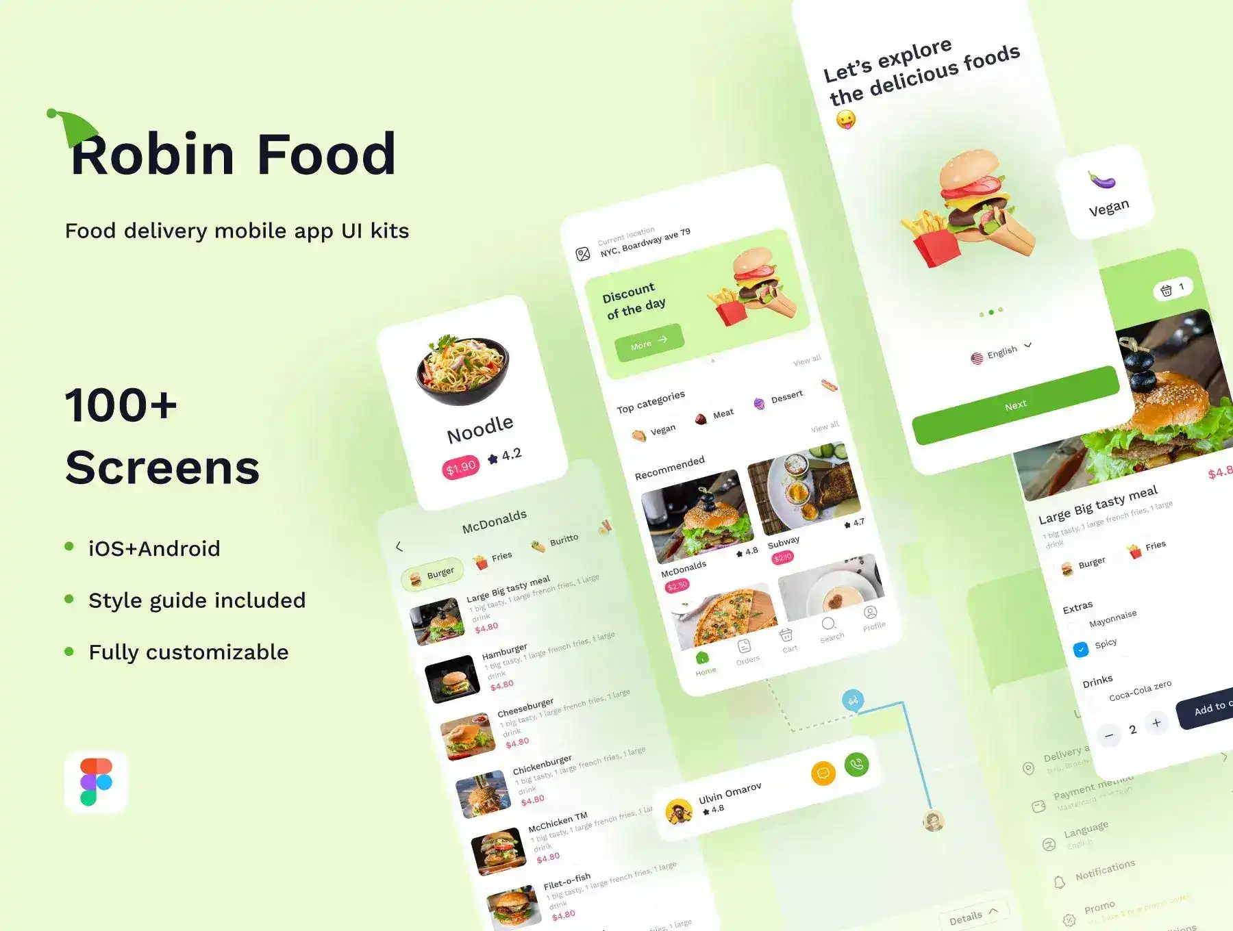 Robin Food mobile app is designed for any delivery field as food, market, restaurants, water, and so on. The design includes both iOS (375x812) and Android (360x800) versions in pixel-perfect, with a total of 100+ screens.