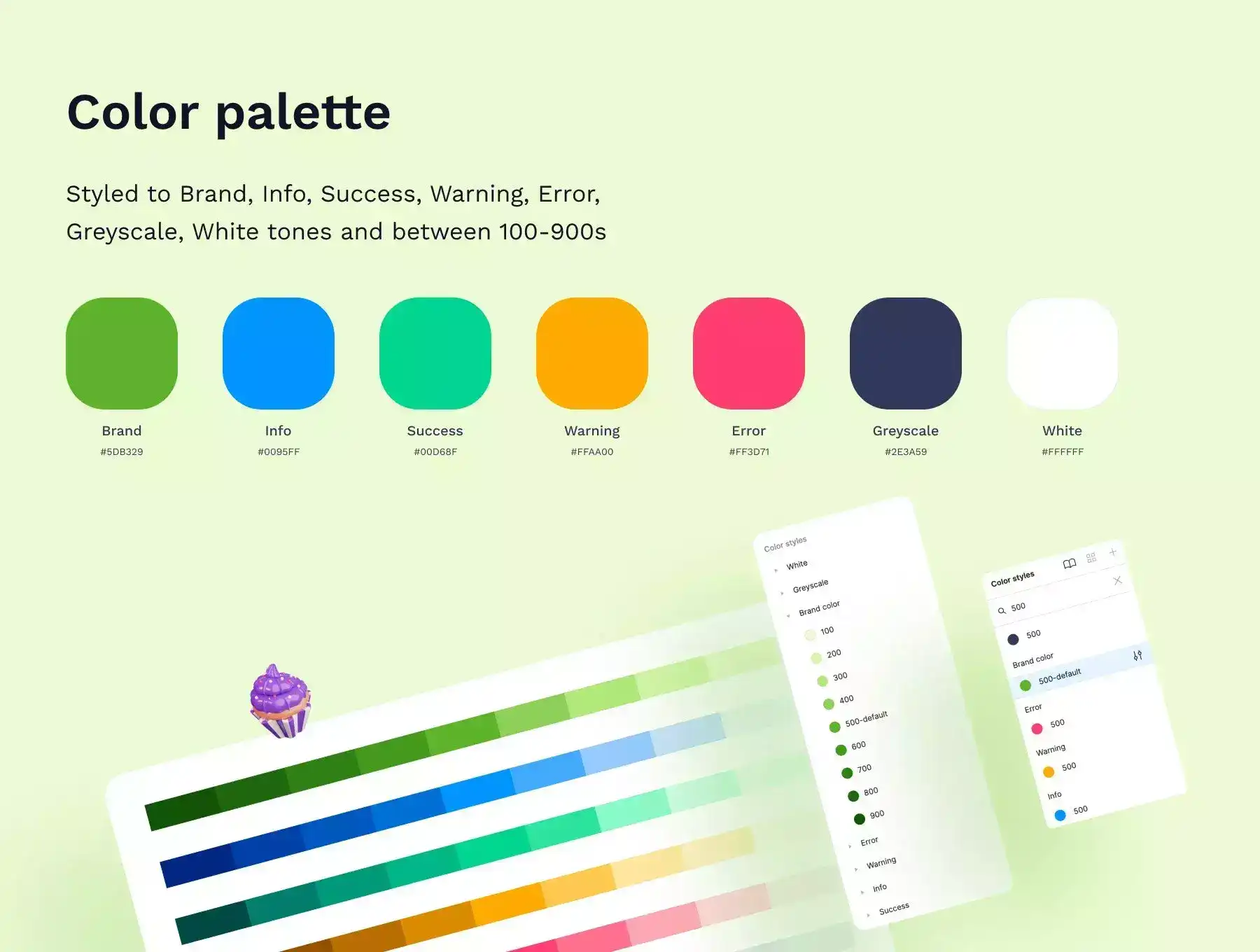 Also, a Style guide was added that consists of a Color palette (brand, info, success, warning, error, greyscale, and white tones between 100...900 shades), Typography (H6...H1, subtitles, body, caption, and overline), UI kits and Icon set (2000+ local and access 6000+ icons).