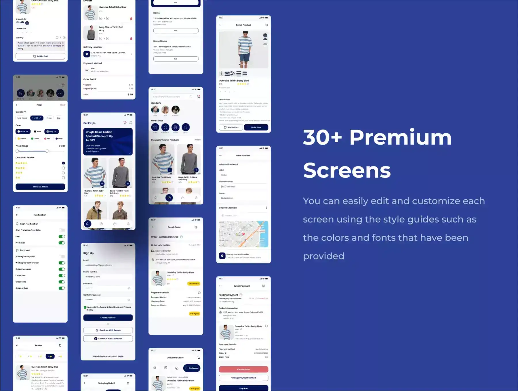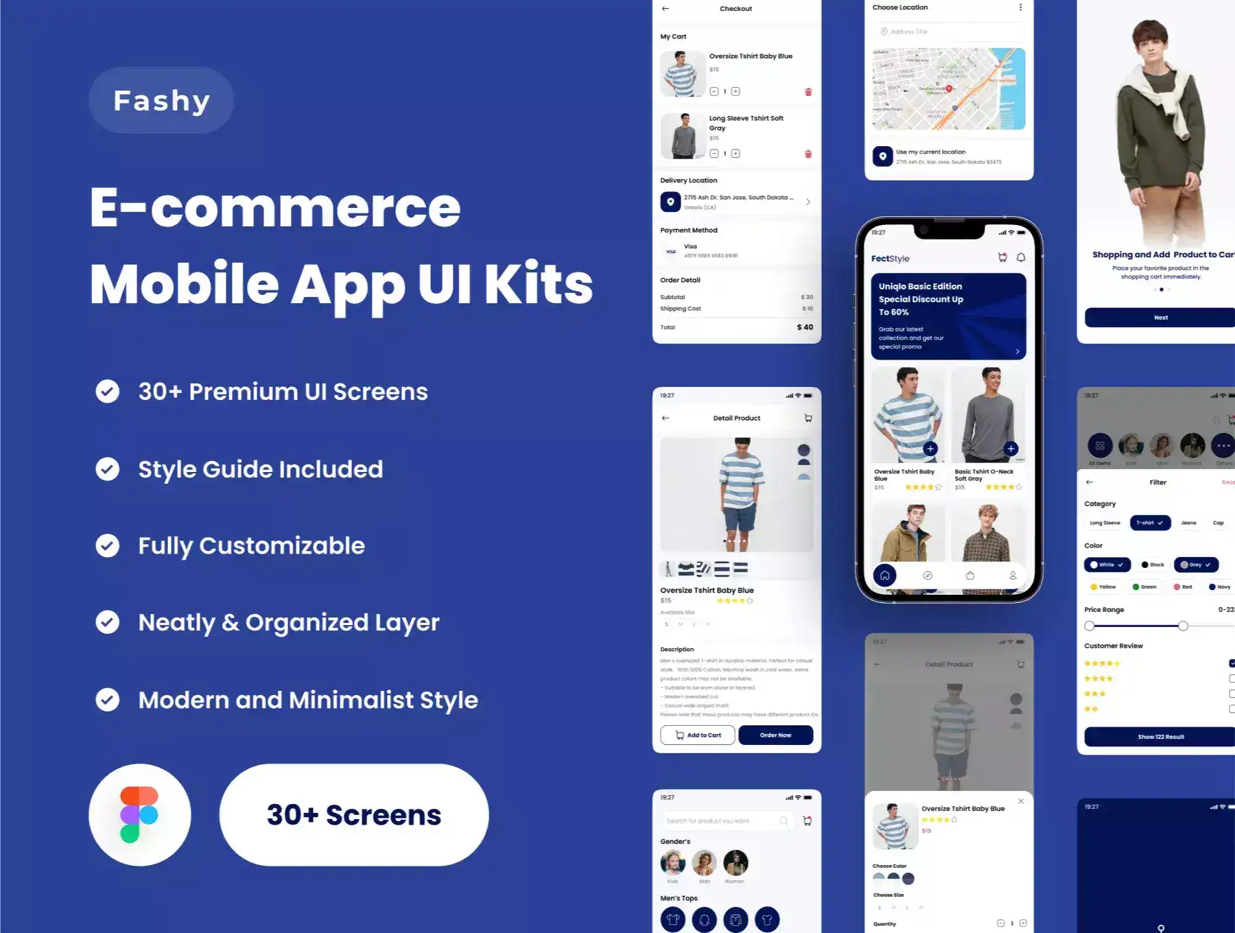 Fashy is compatible with Figma, and is designed with good layer and group organization. There are 30+ screens that can be customized very easily, there is also a style guide such as fonts and colors in it.