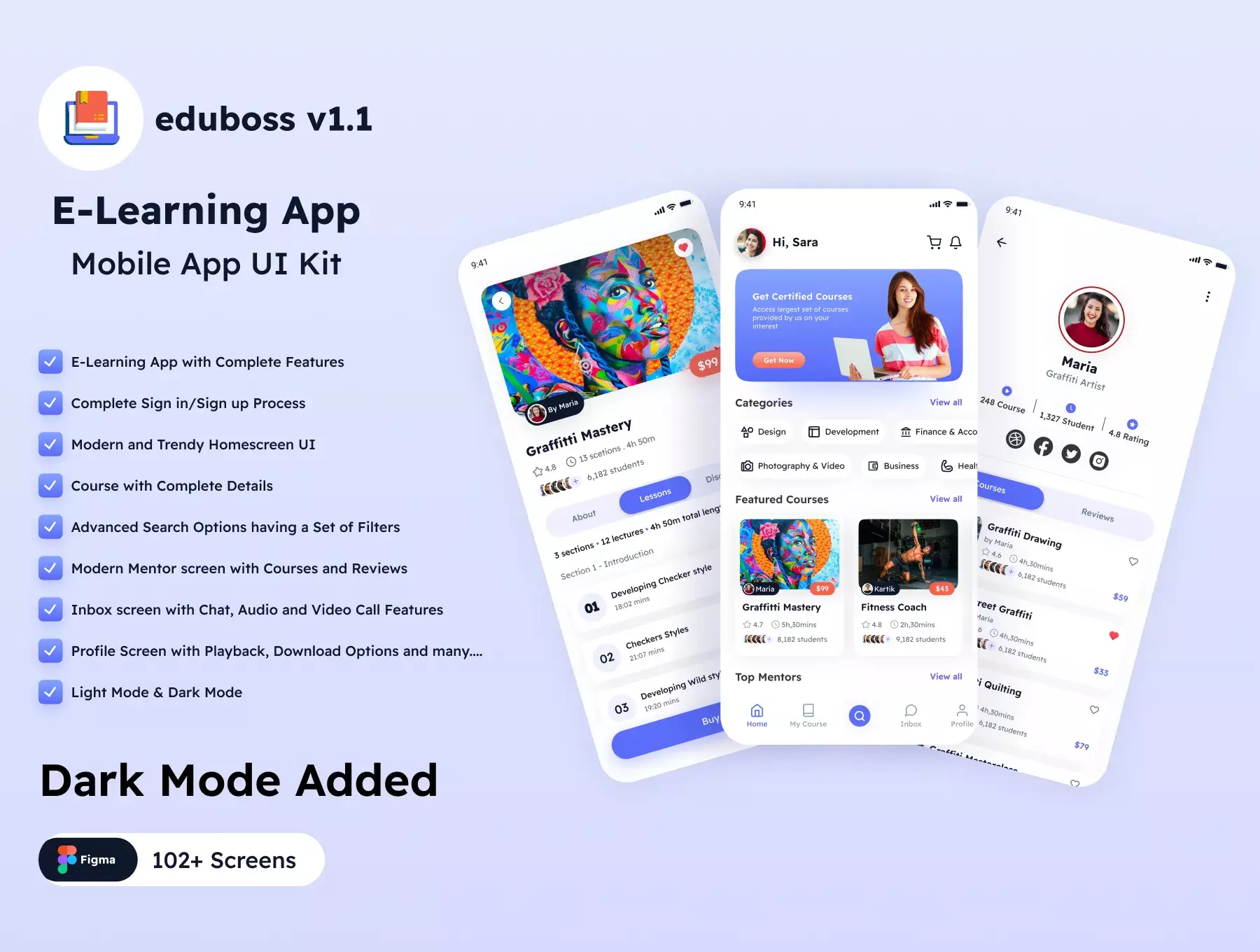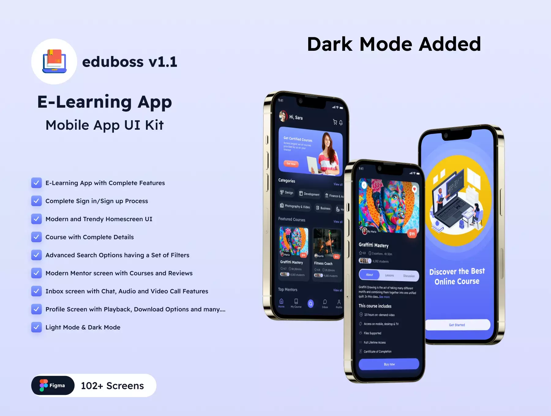 Eduboss is a Premium and High-Quality E-Learning App UI Kit having 102+ High-Quality Screens, having a Modern, Trendy, and UX Friendly Design.