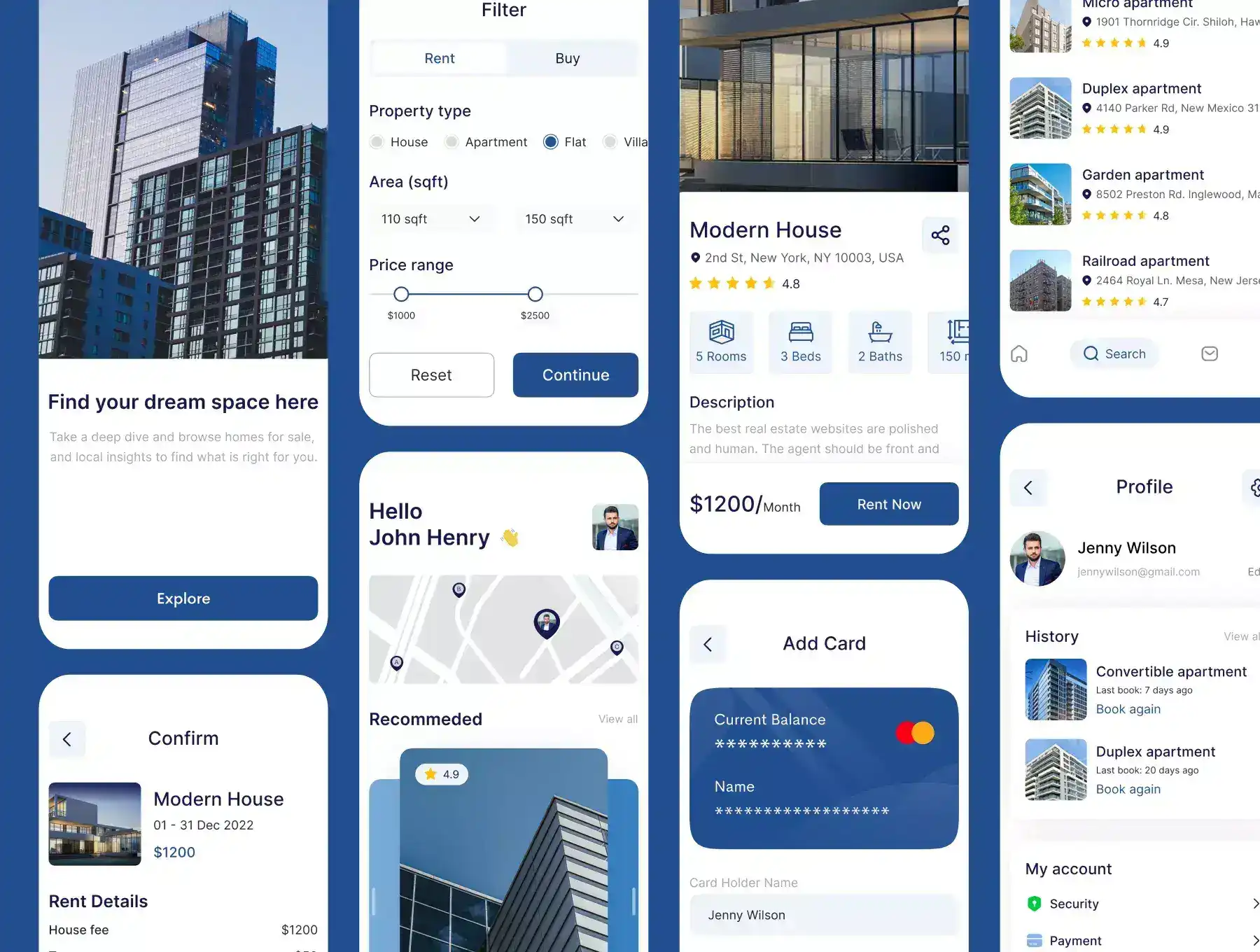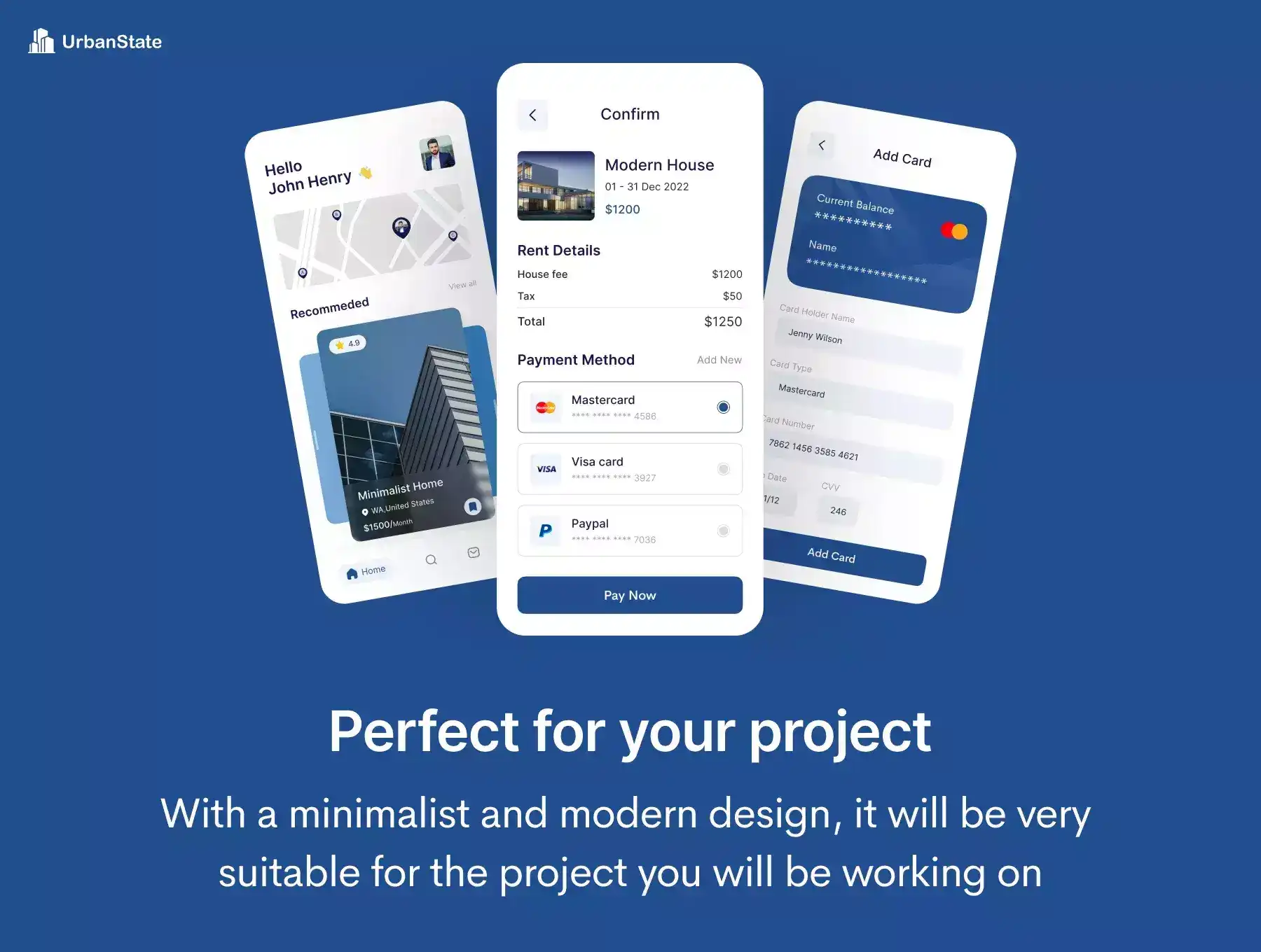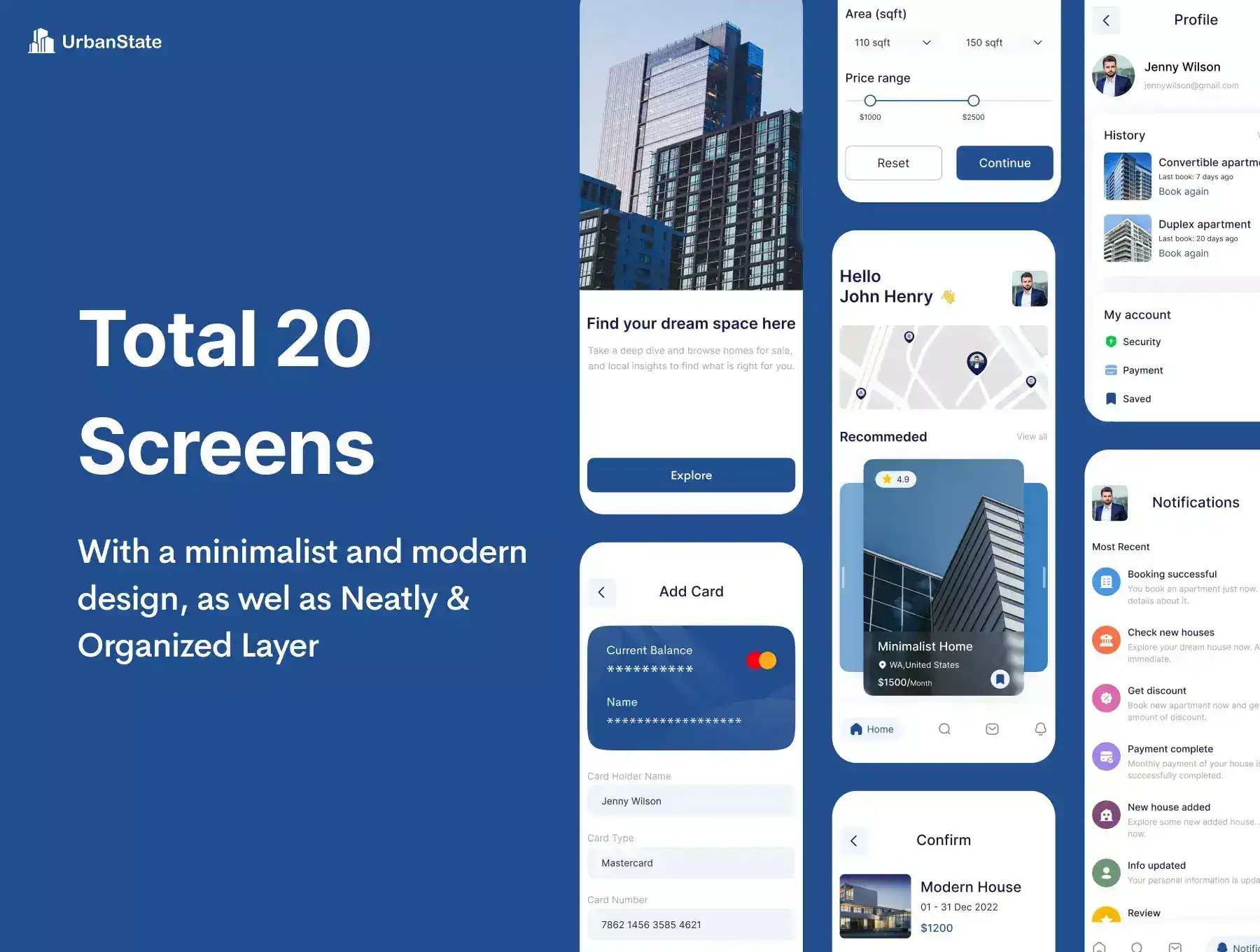 UrbanState - Real State App UI Kit with 20 high-quality screens and is easy to use with clean, neat, and modern design. Available Light theme in Figma.