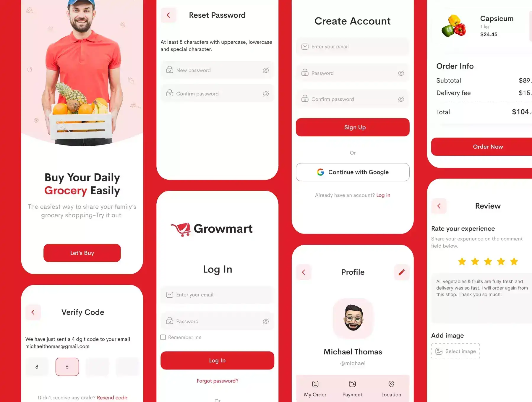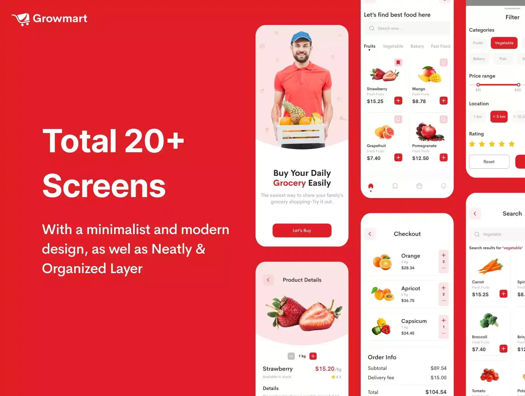 Growmart - Grocery App UI Kit with 20+ high-quality screens and is easy to use with clean, neat, and modern design. Available Light theme in Figma.