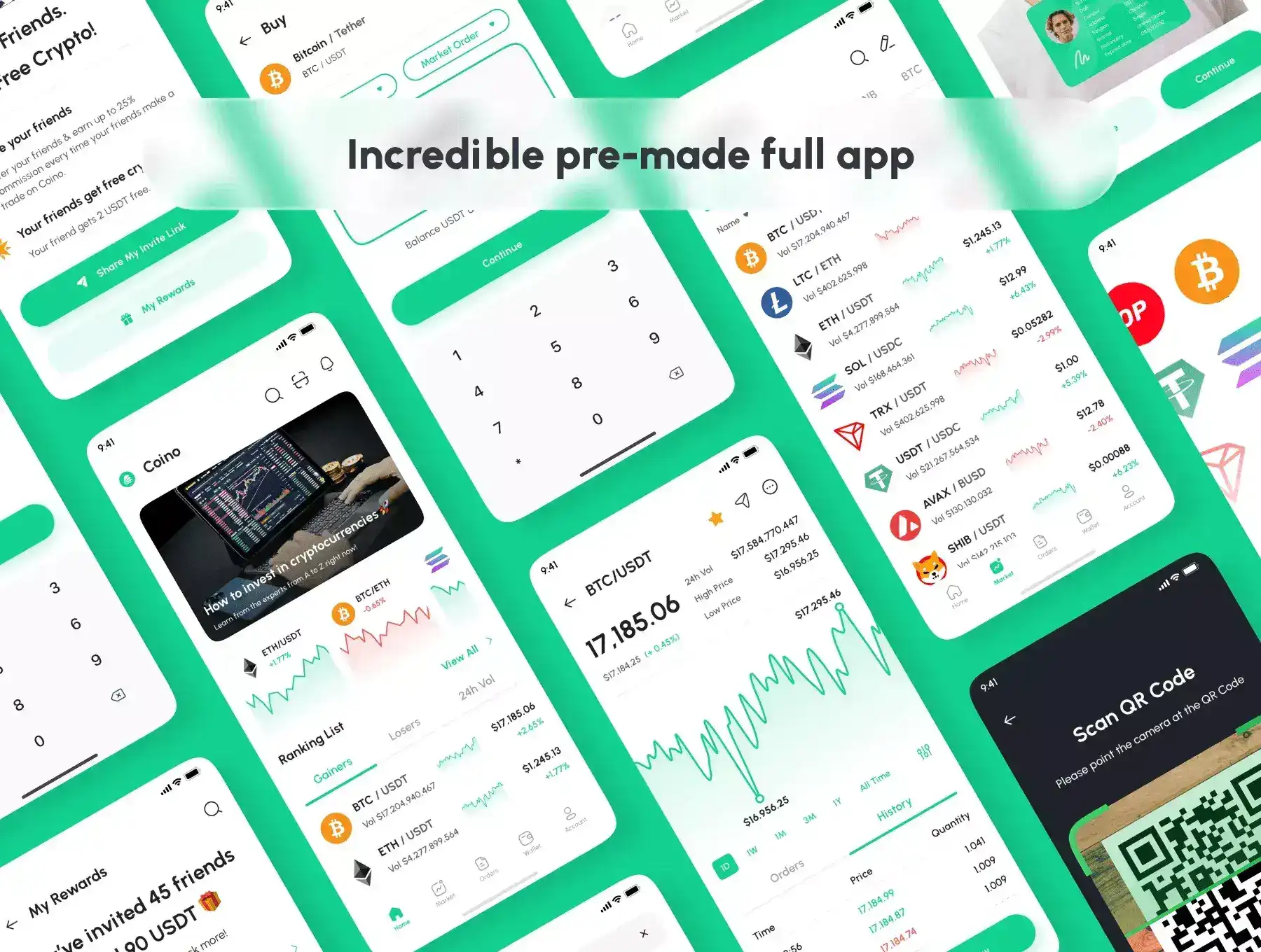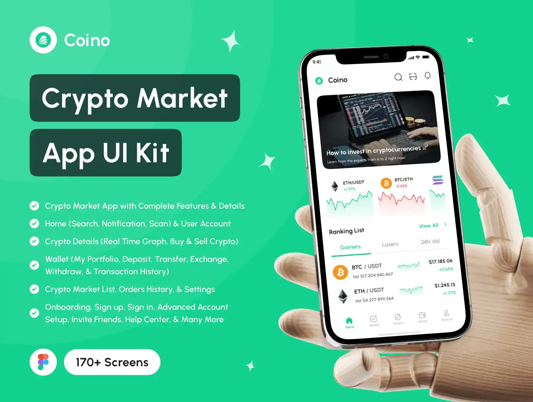 Coino support for iOS/Android (design system included) and 176 screens which is 100% editable & customizable. Designs are available in Figma. In addition, the design is also equipped with a version of Light & Dark Theme.