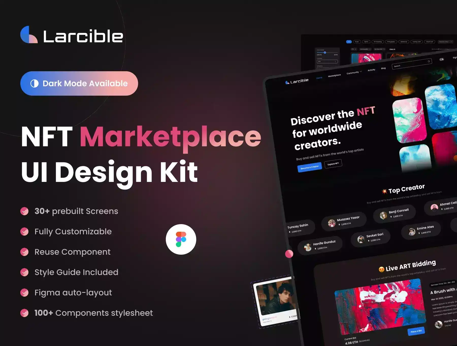 Larcible - NFT Marketplace UI comes with 30+ clean and interactive prebuilt screens which are fully customizable. Furthermore, this UI kit can help you develop prototypes for an NFT marketplace, or for your clients.