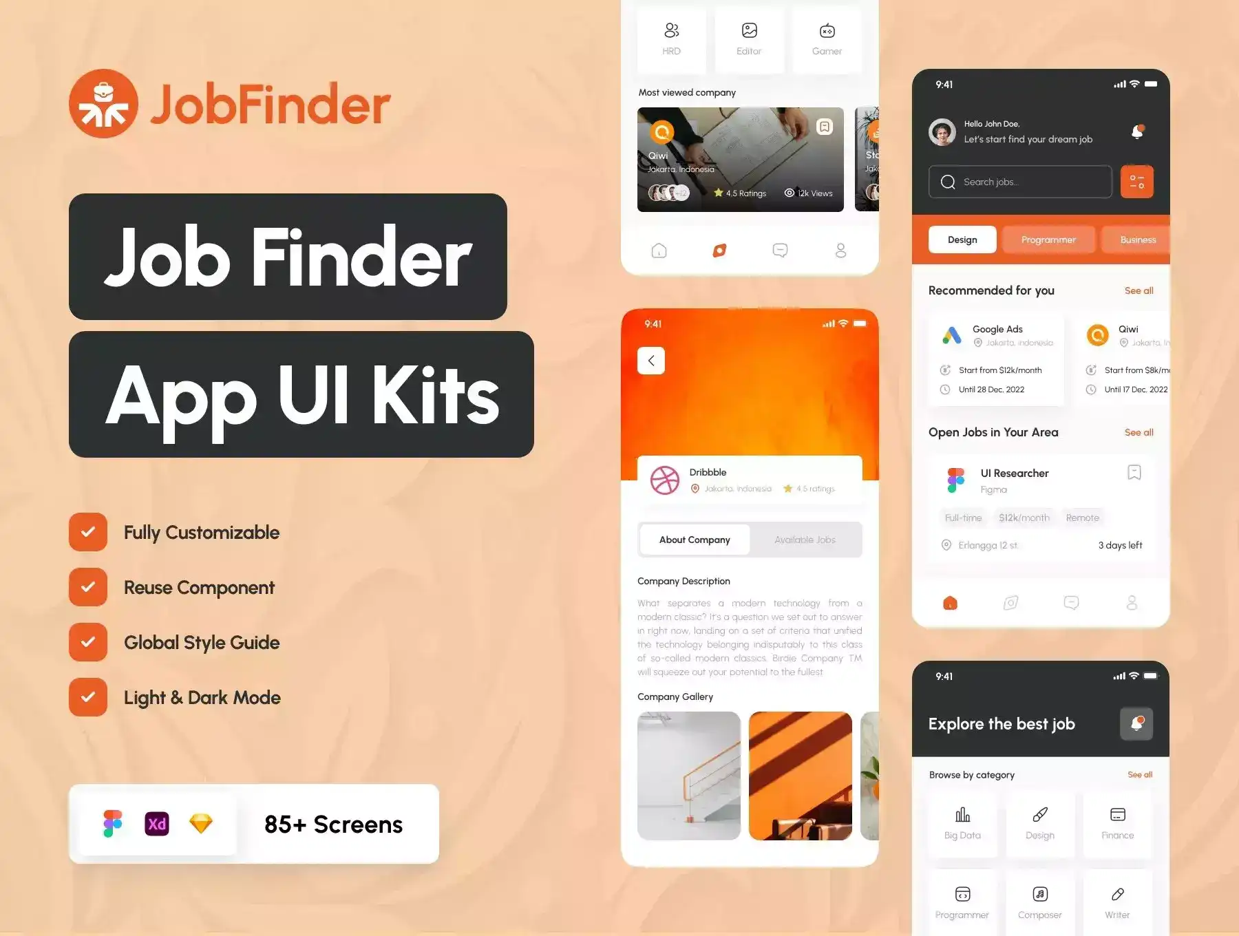 JobFInder is an Job Finder Mobile App with 85++ high-quality screens and is easy to use with clean, neat, and modern design. Available Light and Dark theme in Adobe XD,Figma,Sketch file.