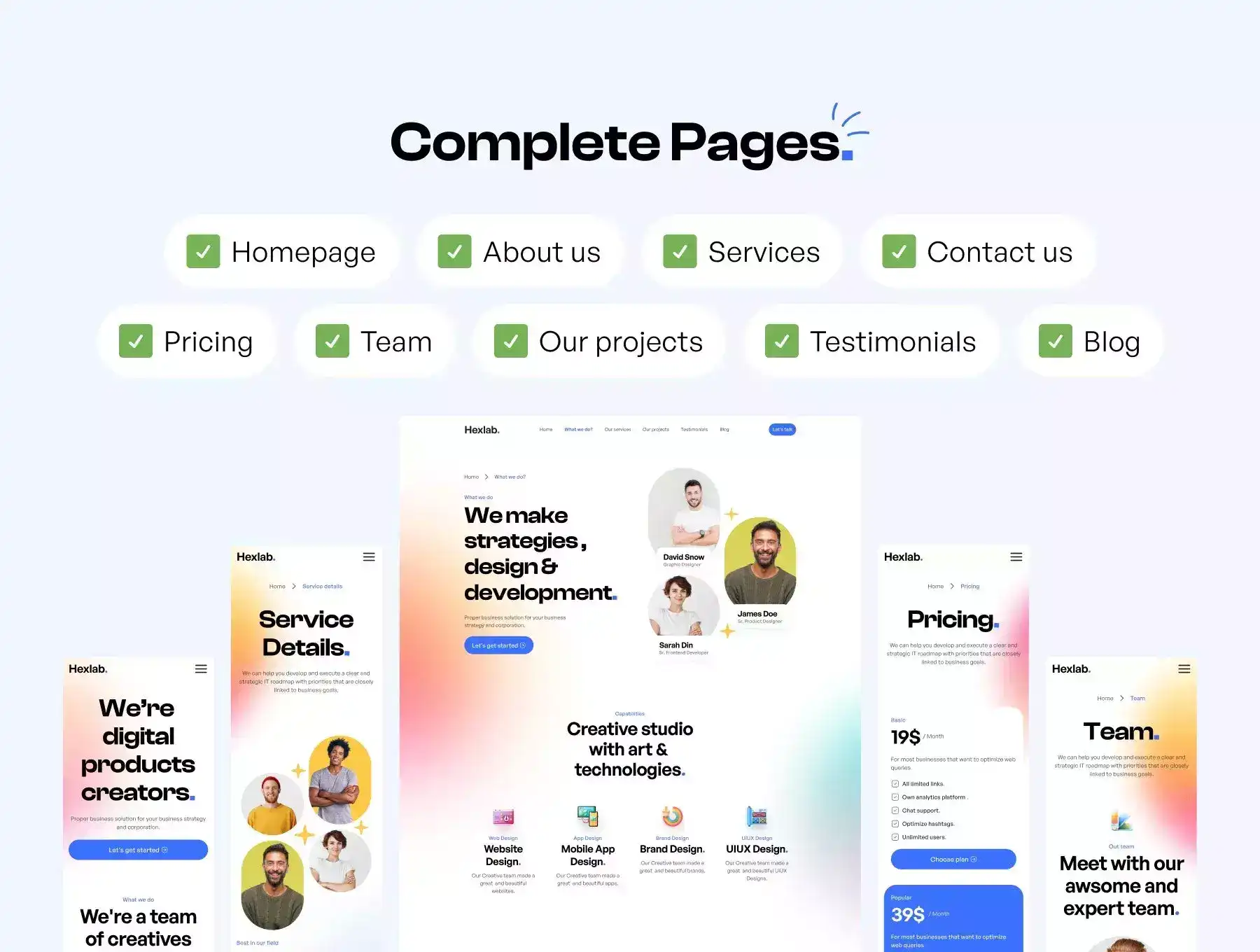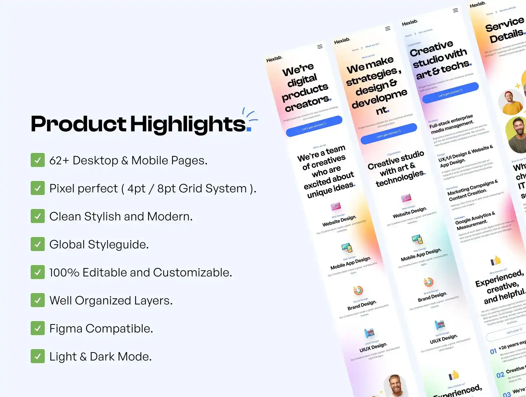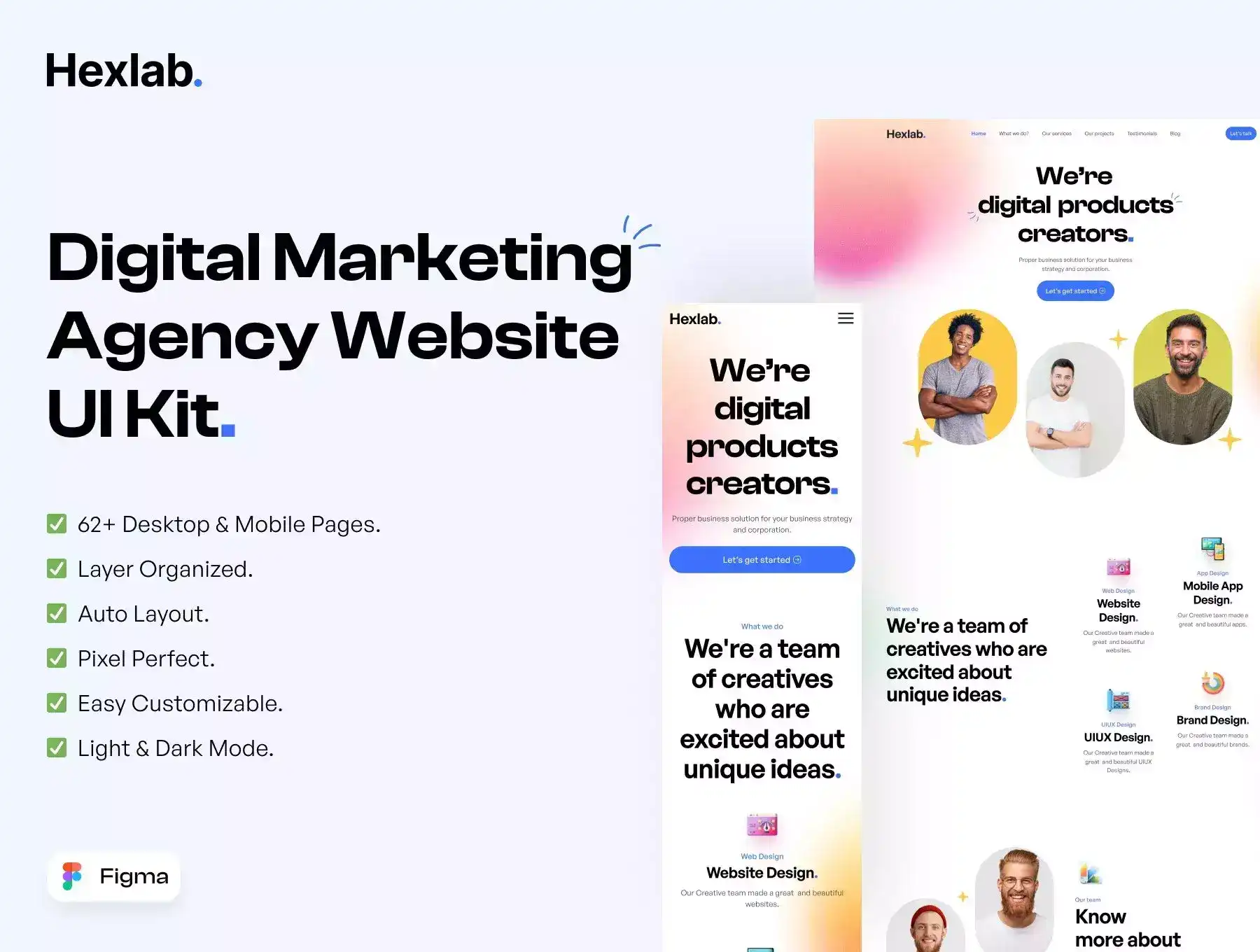 Hexlab is Digital Marketing Agency Website UI Kit will help your Digital Marketing Agency services. It's came with clean and modern style, You can easily edit and customize all elements with design component which can speed up your design process.