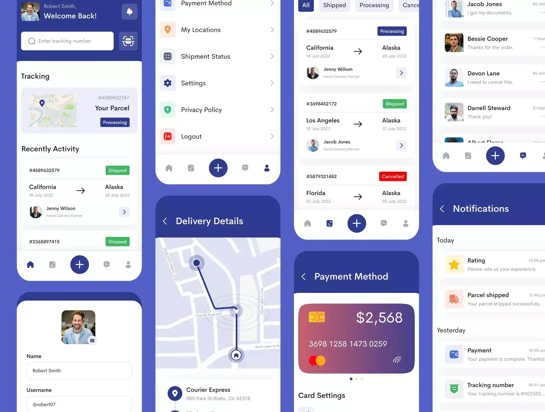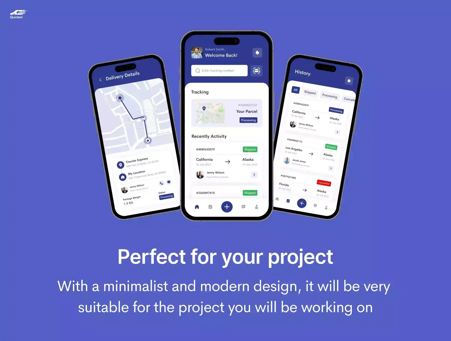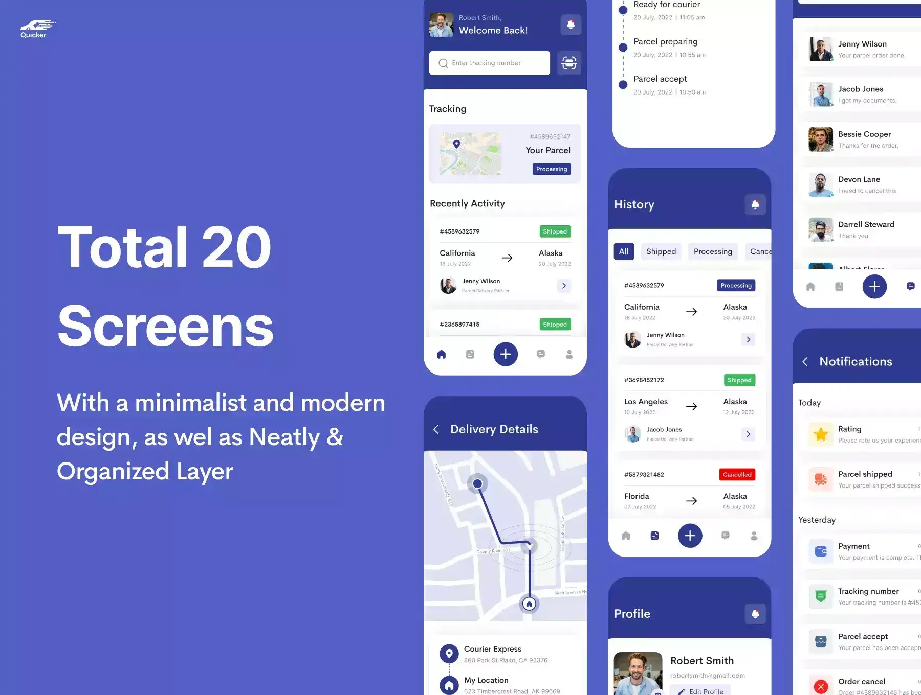 Quicker - Courier Service App UI Kit with 20 high-quality screens and is easy to use with clean, neat, and modern design. Available Light theme in Figma.