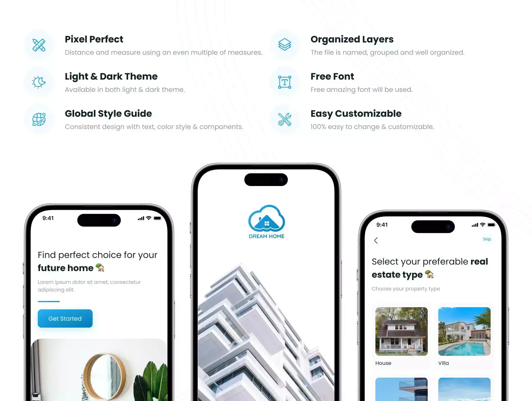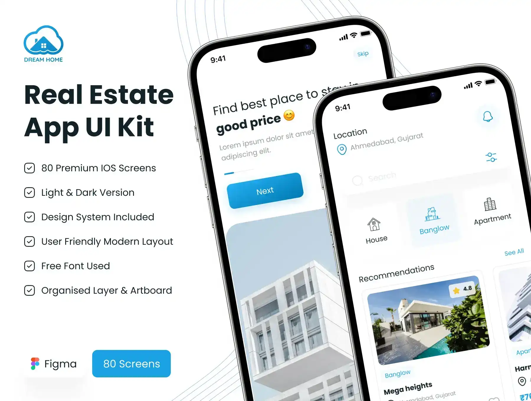 Dream Home is a Real Estate App UI Kit consisting of 80 pixel-perfect screens and easy to use in Figma.